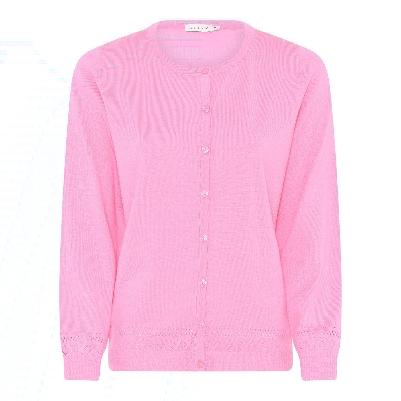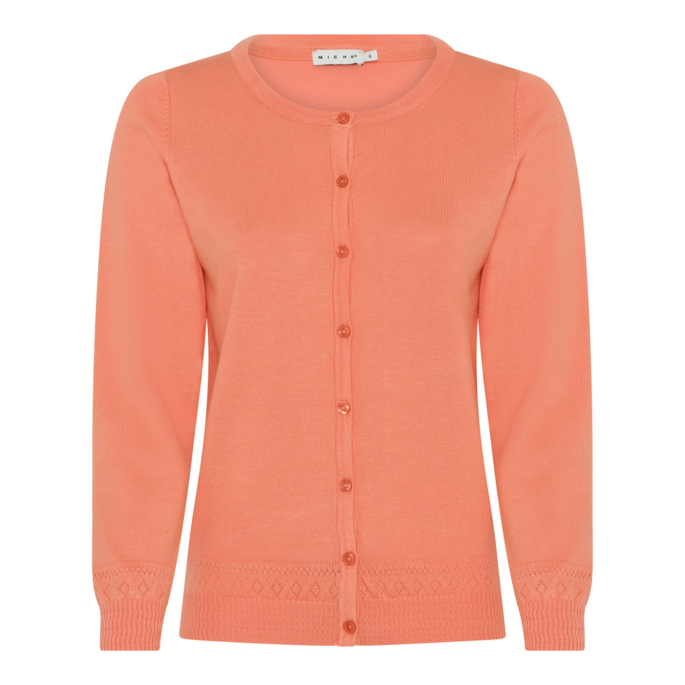 A timeless wardrobe essential crafted from sustainable EcoVero viscose. This soft knit cardigan features a classic button front, delicate openwork detailing on the cuffs and hem, and a comfortable regular fit. Perfect for layering on cooler days while adding a pop of colour to your everyday look.
