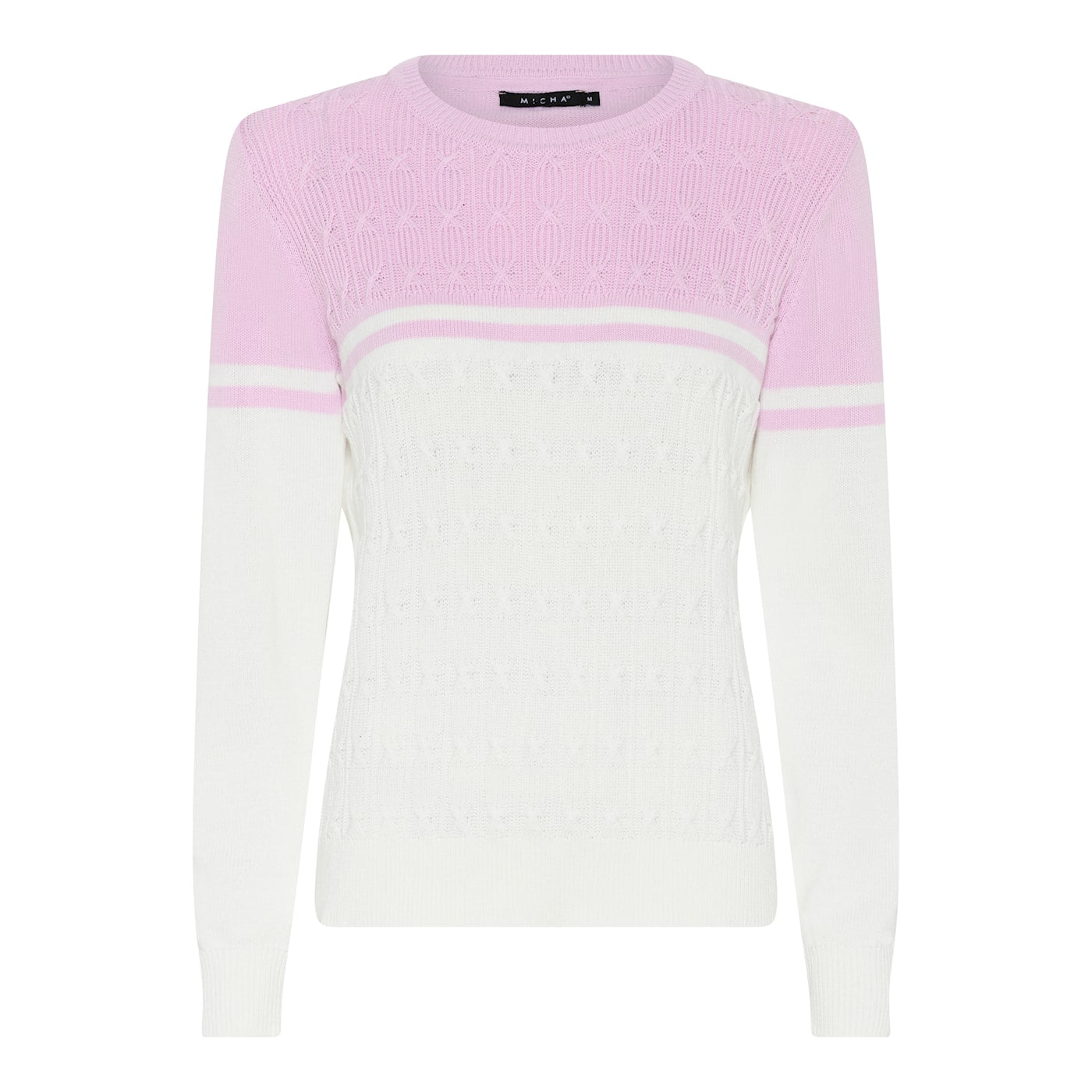 A classic and stylish cable knit jumper crafted from soft cotton for all-day comfort. Featuring a timeless two-tone design, intricate cable detailing, and a round neckline, this sweater combines elegance with casual wearability. The ribbed cuffs and hem provide a snug fit, making it a perfect layering piece for cooler days. Pair it with jeans or tailored trousers for a chic yet relaxed look.