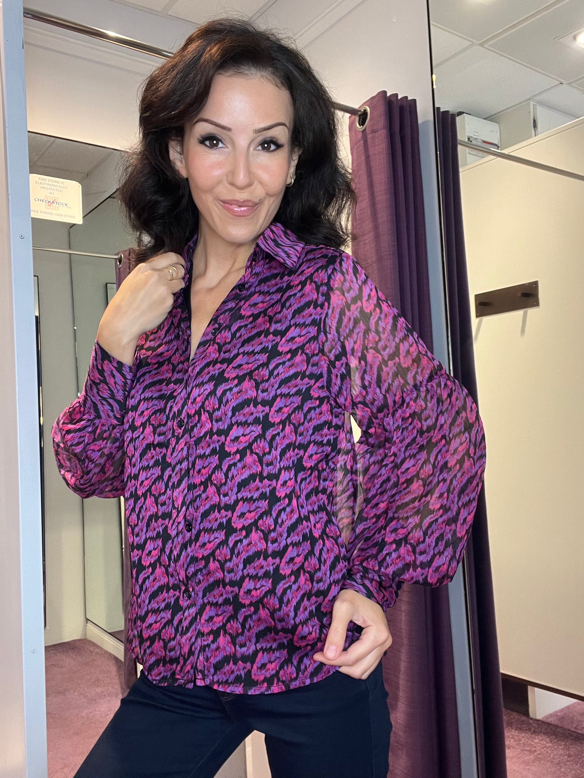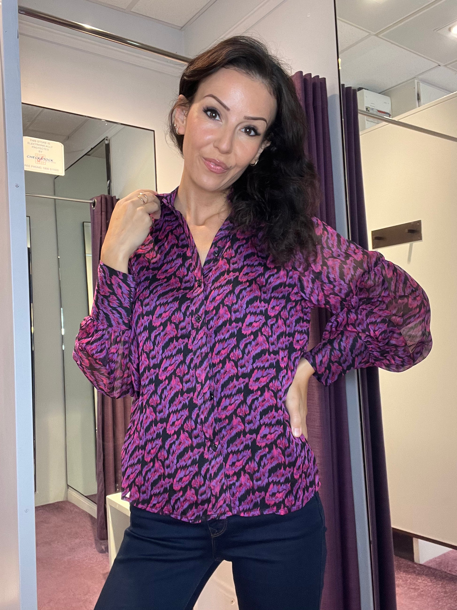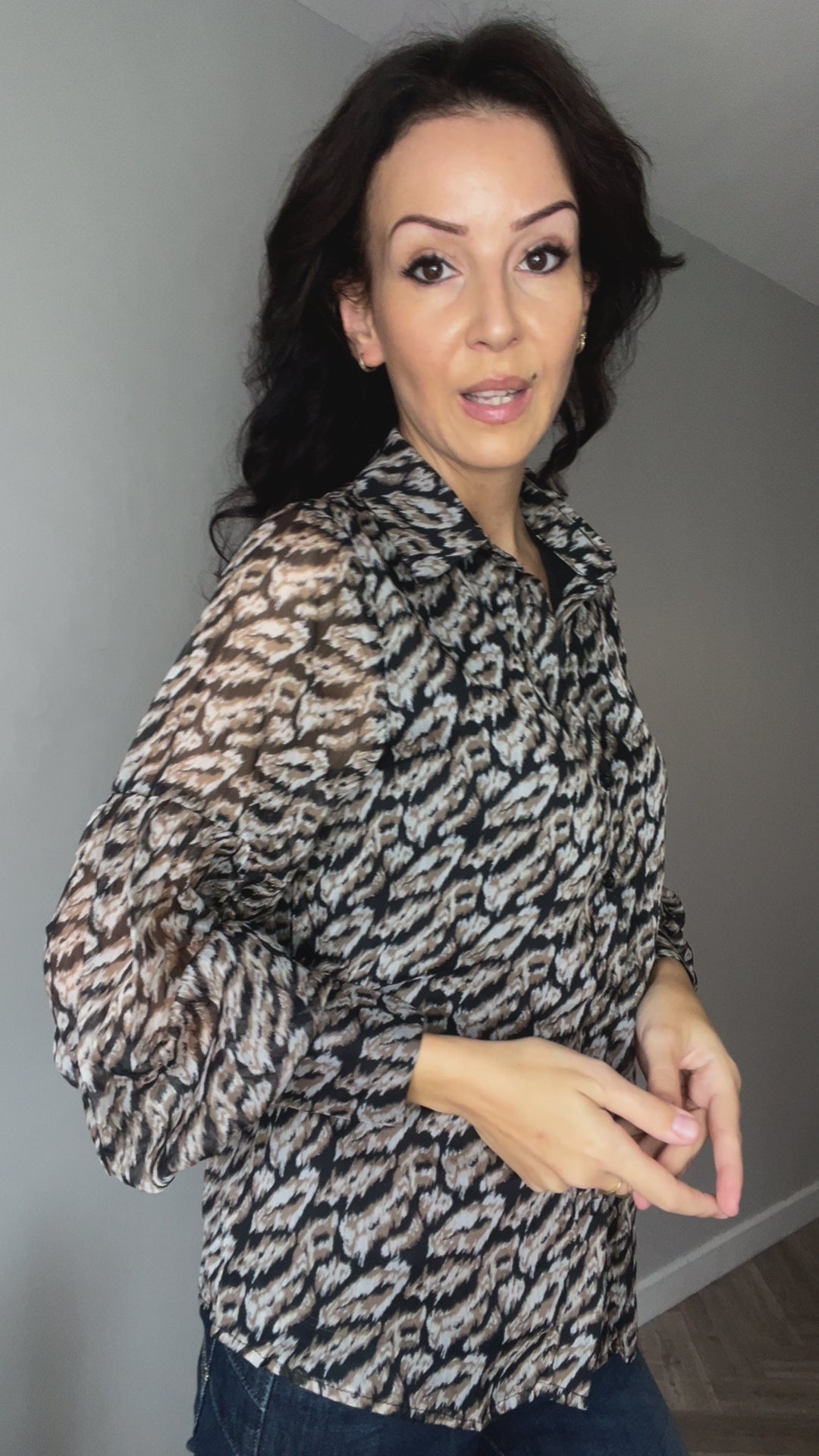 Women's blouse is made of light translucent fabric with animalistic pattern in black/purple and pink colours. The model has a loose fit, classic lapel collar and long sleeves with voluminous buttoned cuffs. The sleeves are decorated with airy flounces, which gives them additional texture and dynamism. The fastening is located at the front and is made in the form of buttons running along the entire length.