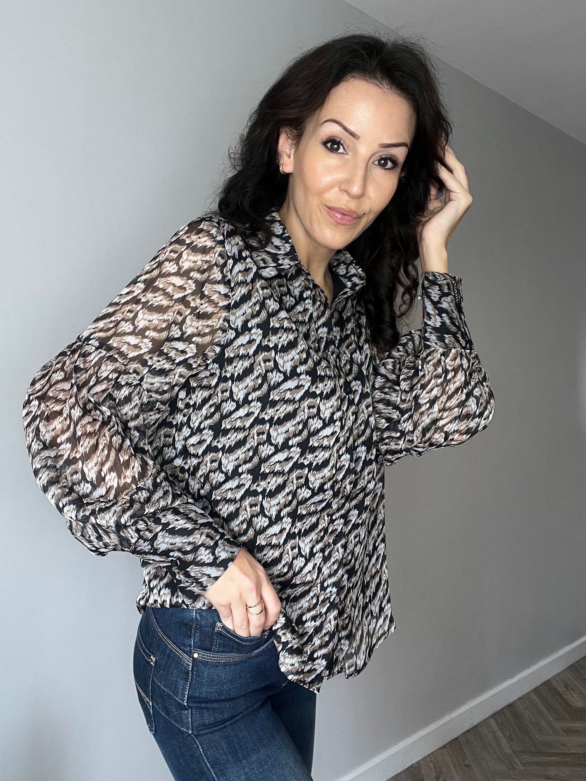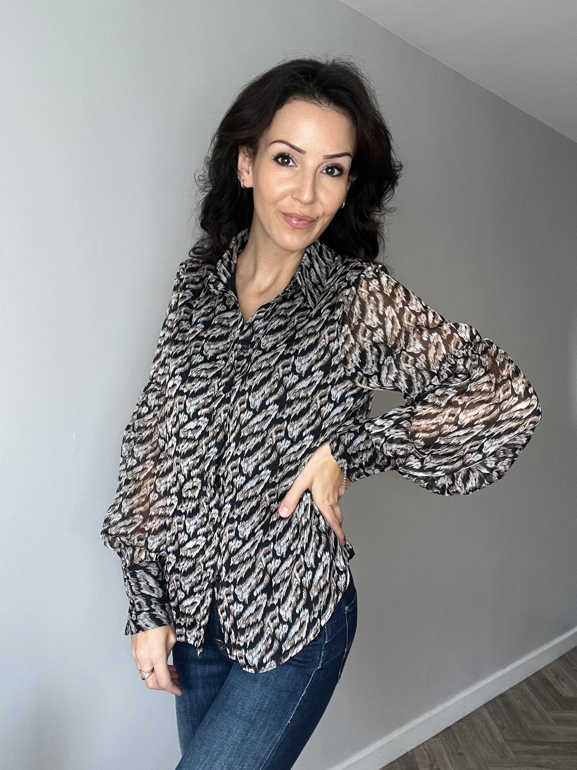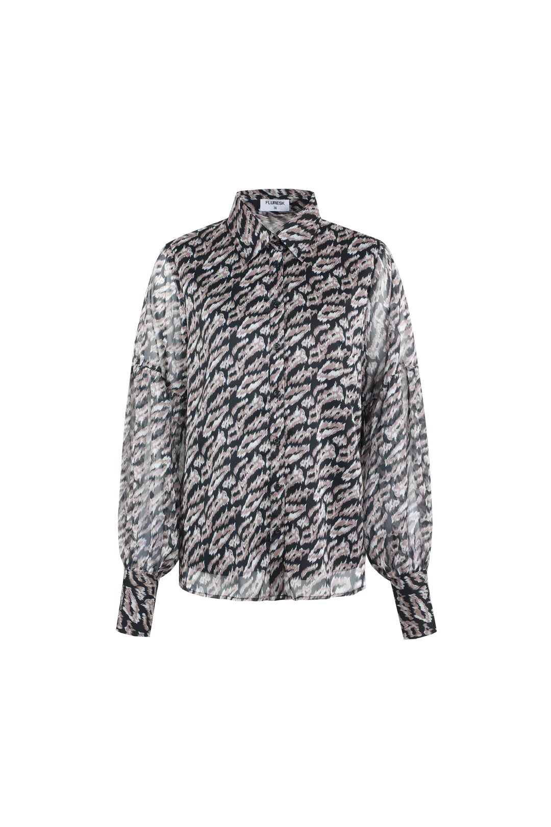 Women's blouse is made of light translucent fabric with animalistic pattern in black/purple and pink colours. The model has a loose fit, classic lapel collar and long sleeves with voluminous buttoned cuffs. The sleeves are decorated with airy flounces, which gives them additional texture and dynamism. The fastening is located at the front and is made in the form of buttons running along the entire length.