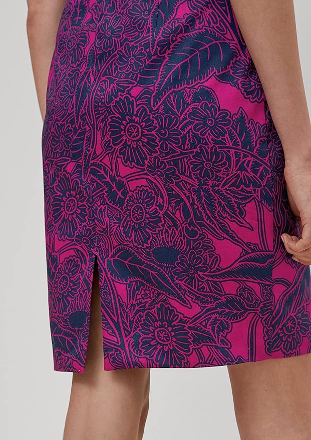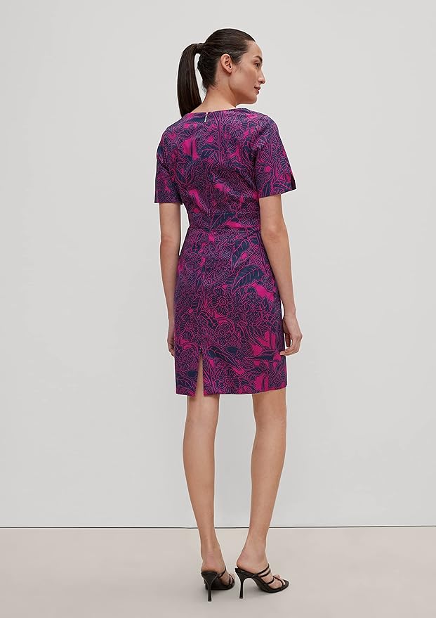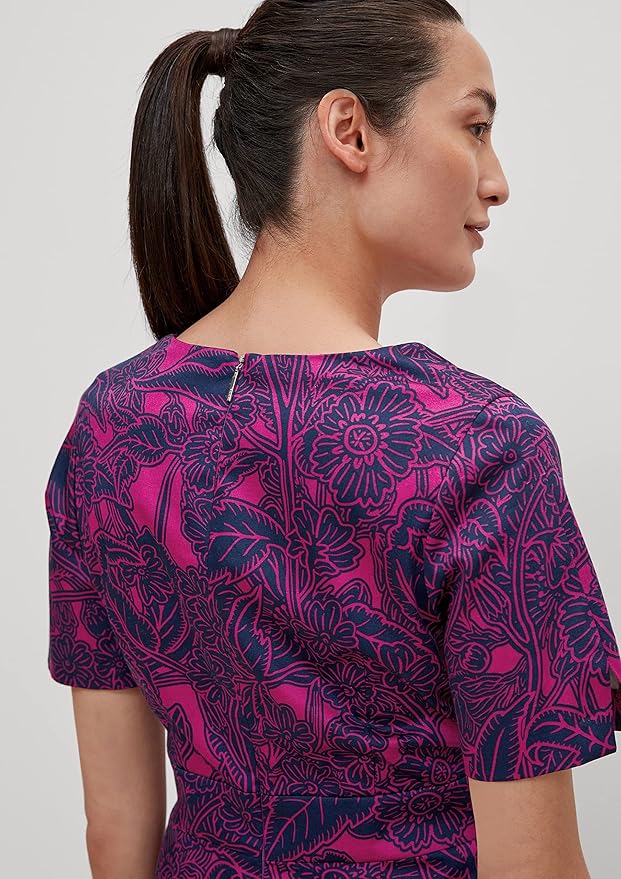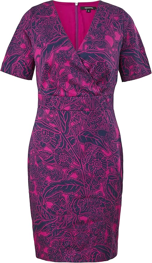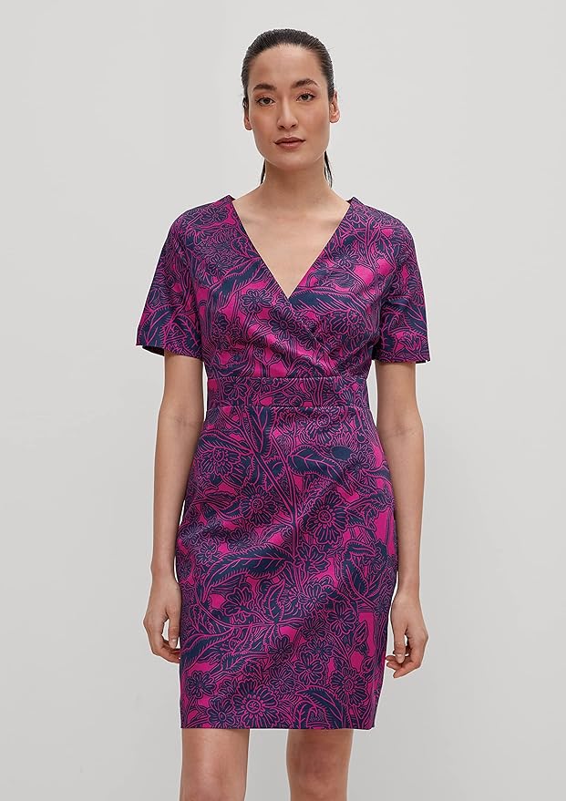 This short-sleeve dress by Comma features a feminine wrap-effect neckline and a figure-enhancing fit. Made from a soft cotton blend with added stretch, it’s both comfortable and flattering. The bold floral print adds a stylish touch, making it a perfect choice for special occasions, events or a polished daytime look.