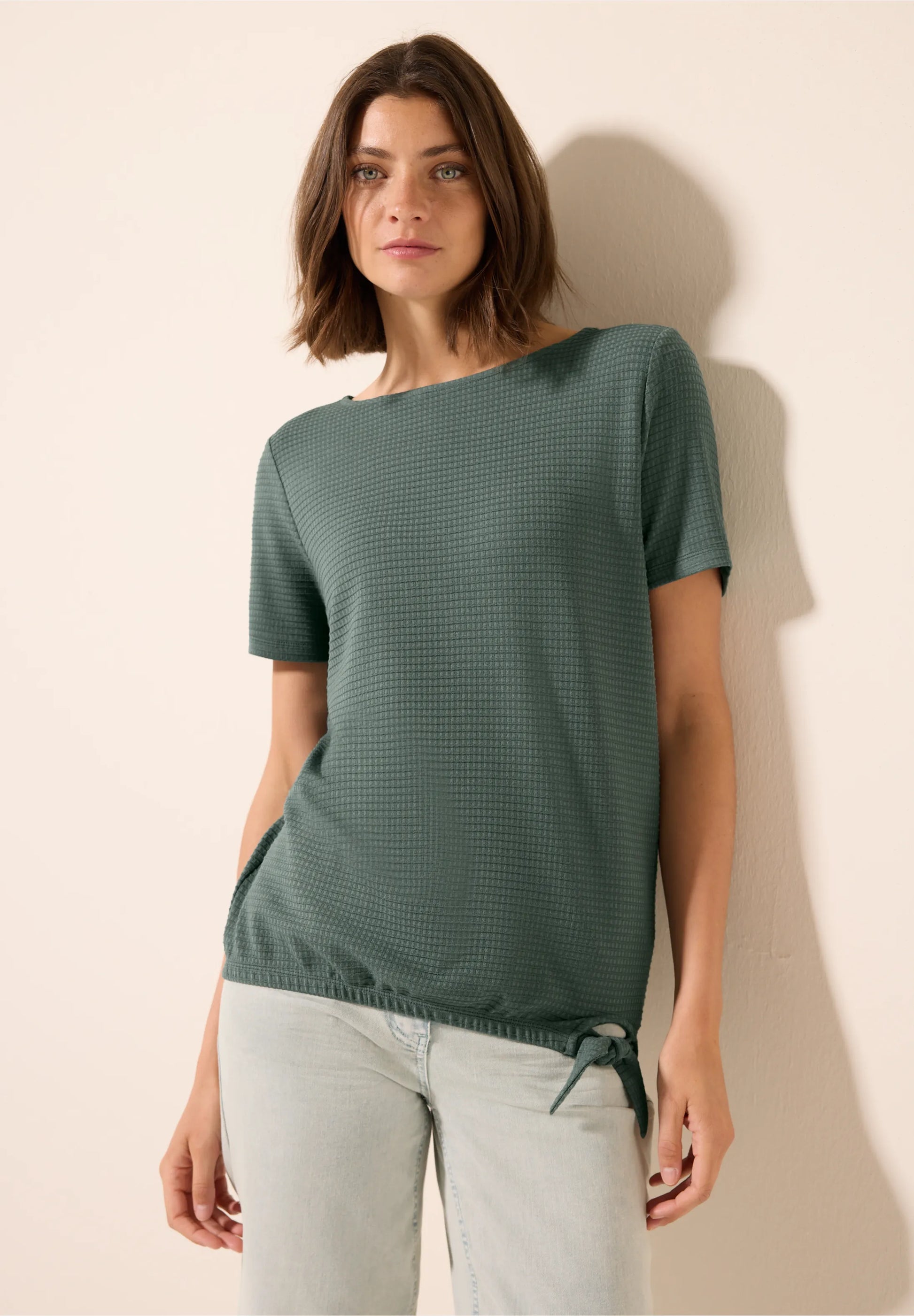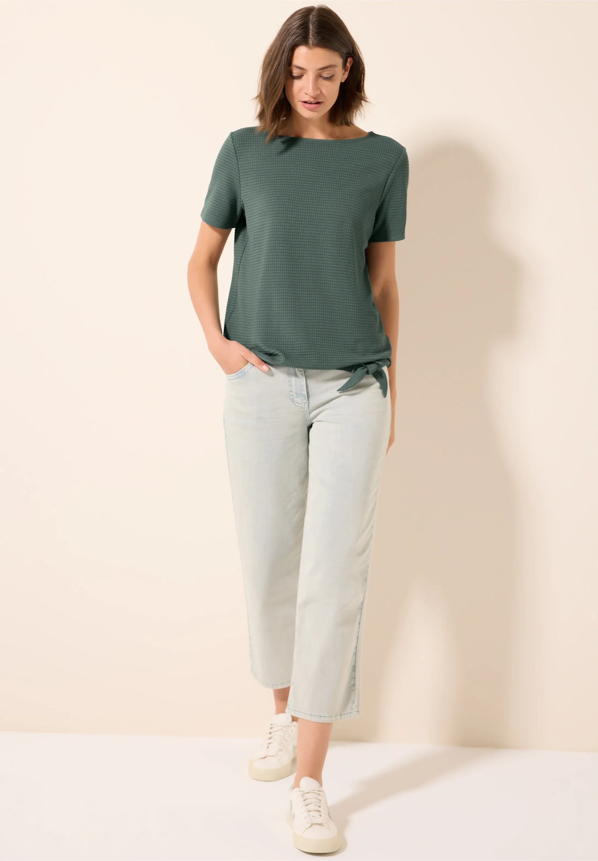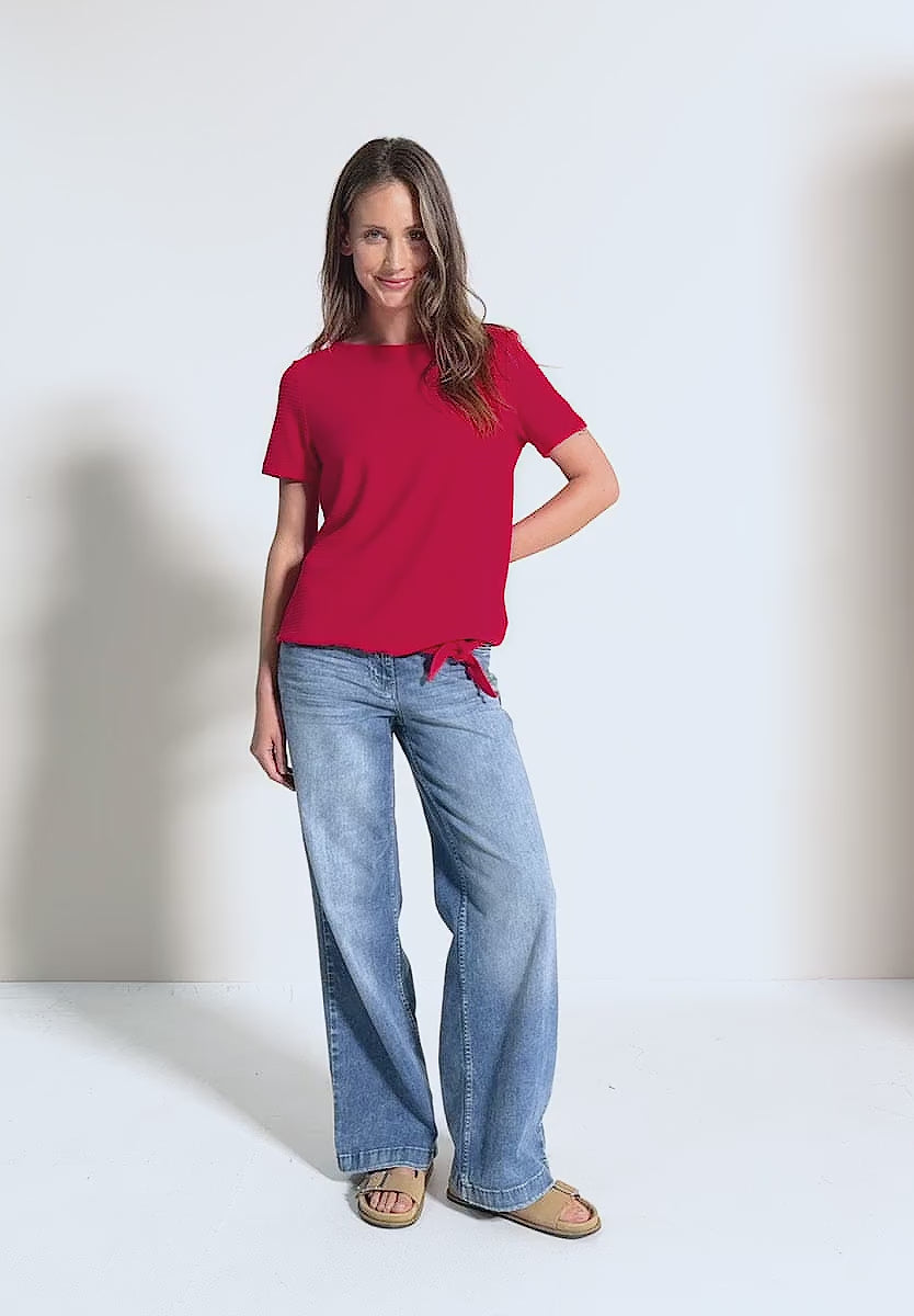 This casual summer T-shirt features a flattering boat neckline and a soft, stretchy viscose blend for a light and breezy feel. The elasticated hem is finished with a knot detail, adding a subtle twist to a simple silhouette. Perfect for relaxed everyday outfits , just pair with denim or linen for an effortless warm-weather look.