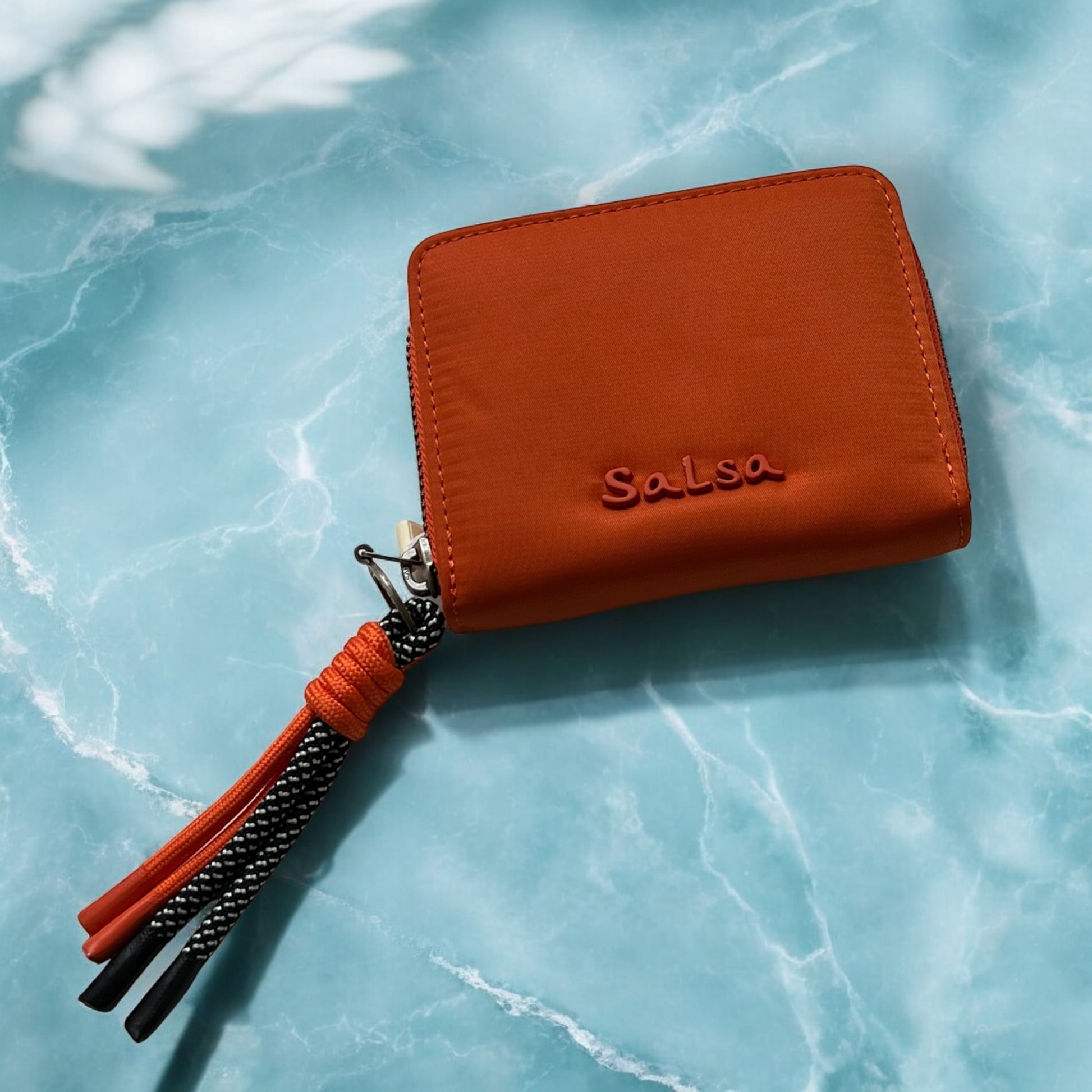 This vibrant orange wallet combines style and functionality, crafted from high-quality textile. It features a bold embossed "Salsa" logo on the front, adding a touch of flair. With a secure zippered compartment for coins and multiple card slots, it's perfect for keeping your essentials organised. The unique braided keychain adds both practicality and a stylish accent, making it easy to carry or attach to a bag. Compact yet versatile, this wallet is an ideal choice for those who value both style and convenience.