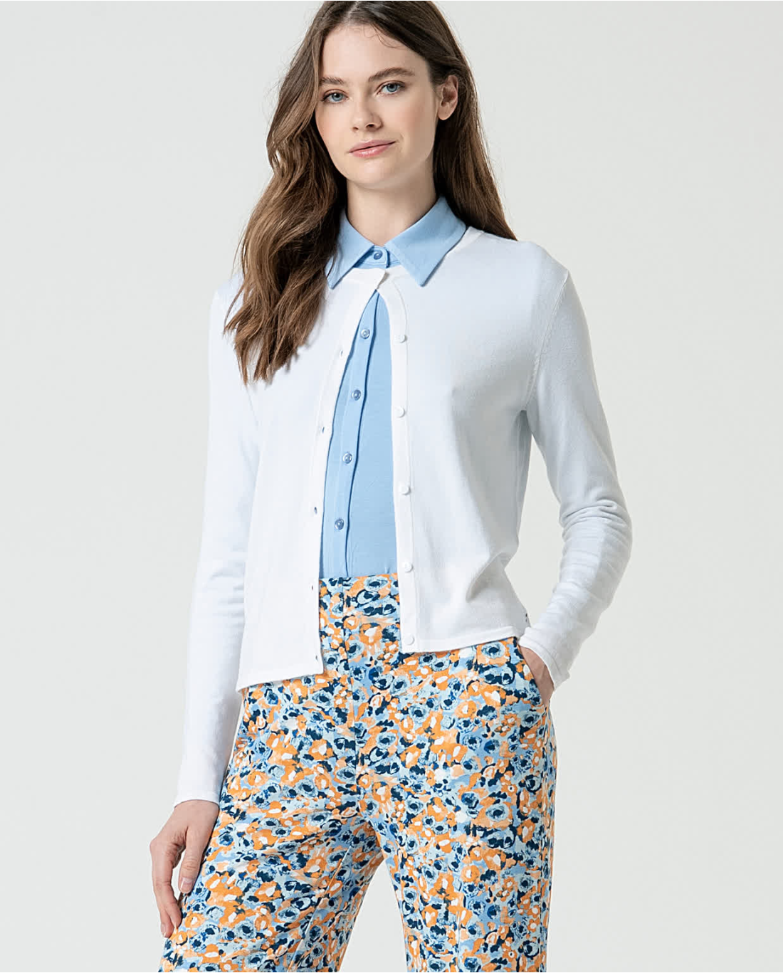 A timeless button-up cardigan designed for effortless layering. Featuring a round neckline, long sleeves, and a refined button closure, this versatile piece offers both style and comfort. The soft, lightweight knit ensures a flattering fit, making it perfect for wearing over blouses, dresses, or pairing with jeans for a casual yet polished look. An essential addition to any wardrobe for year-round elegance.
