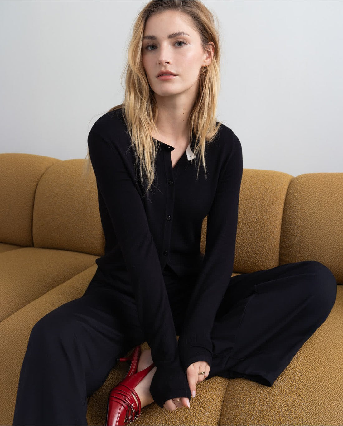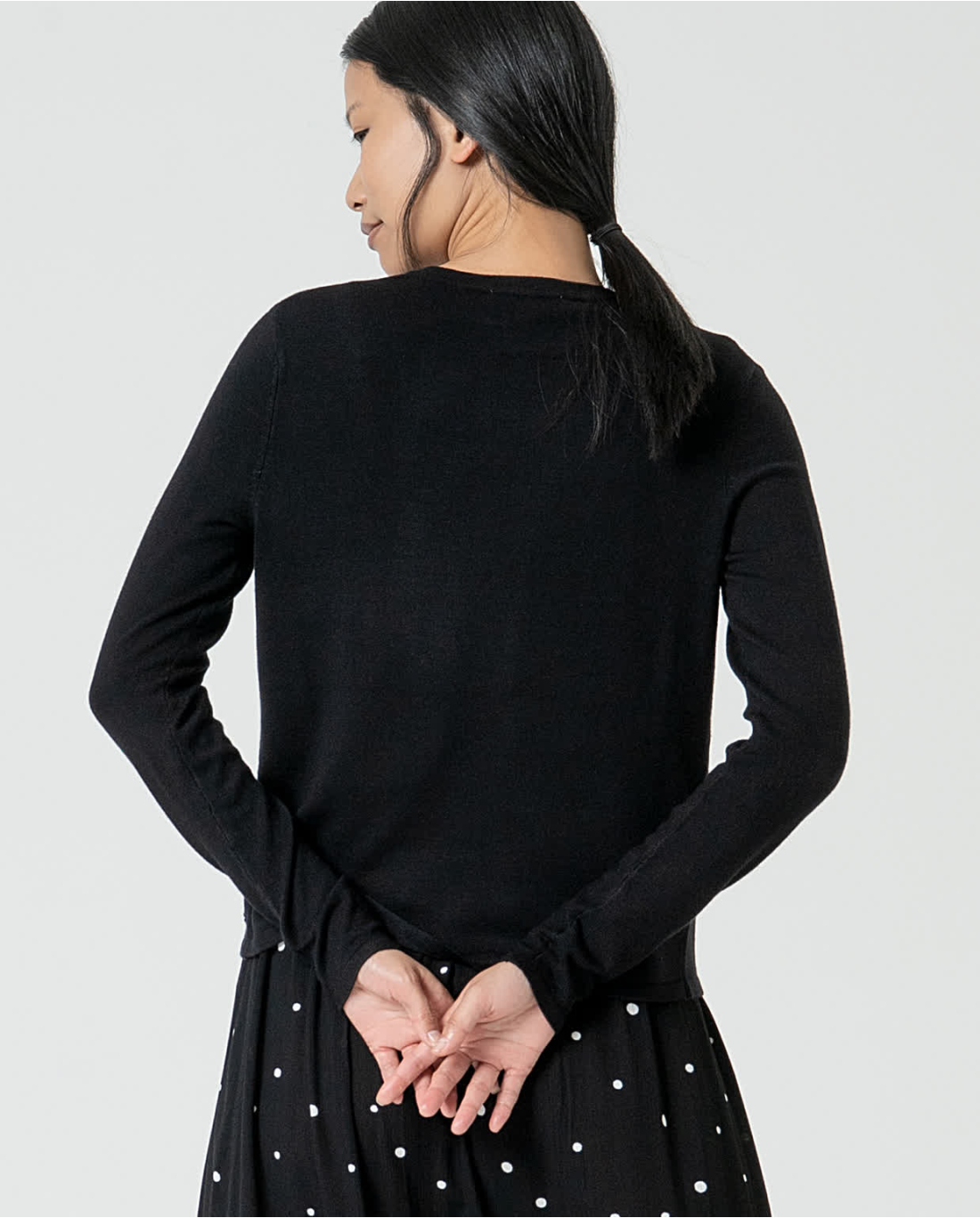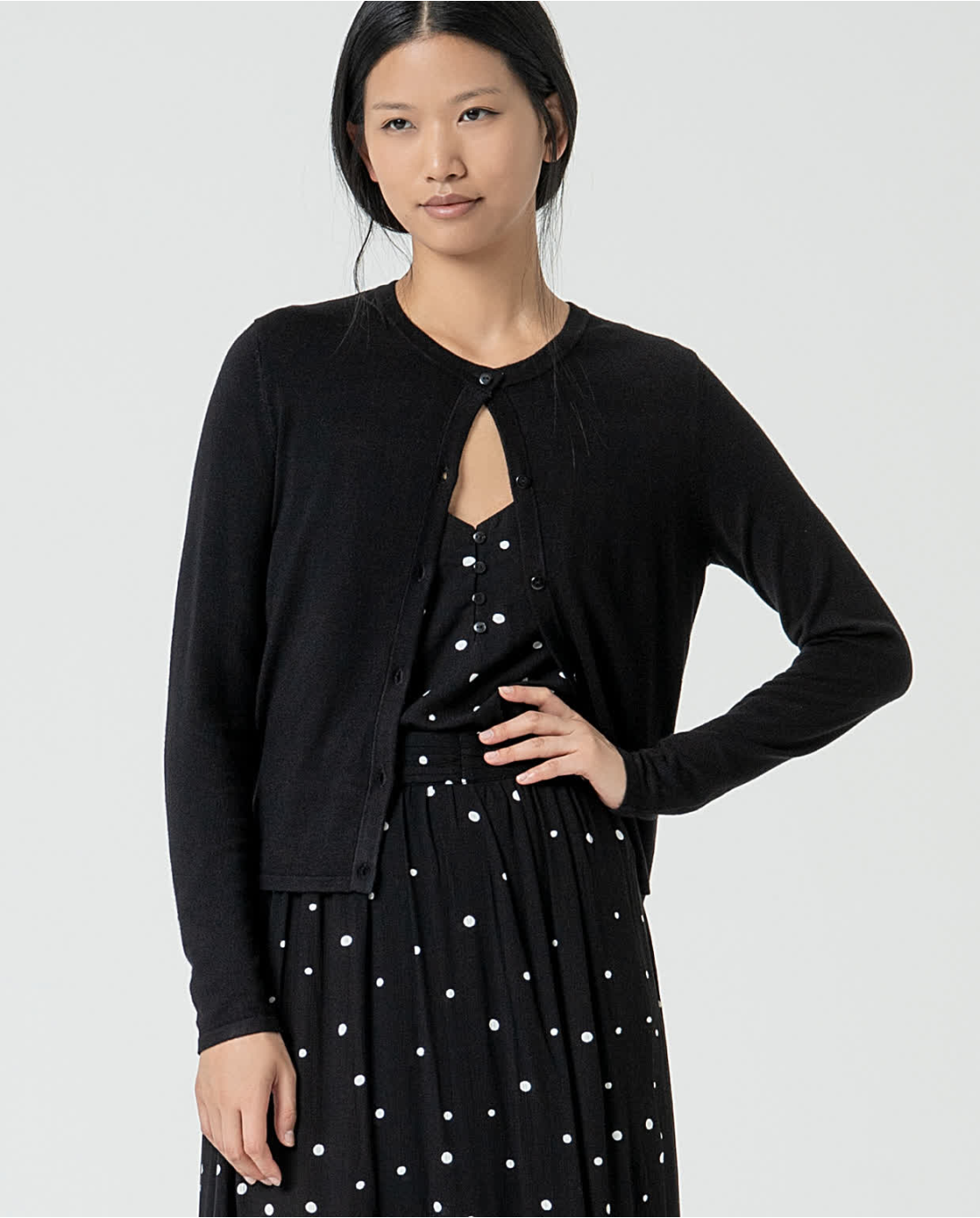 A timeless button-up cardigan designed for effortless layering. Featuring a round neckline, long sleeves, and a refined button closure, this versatile piece offers both style and comfort. The soft, lightweight knit ensures a flattering fit, making it perfect for wearing over blouses, dresses, or pairing with jeans for a casual yet polished look. An essential addition to any wardrobe for year-round elegance.