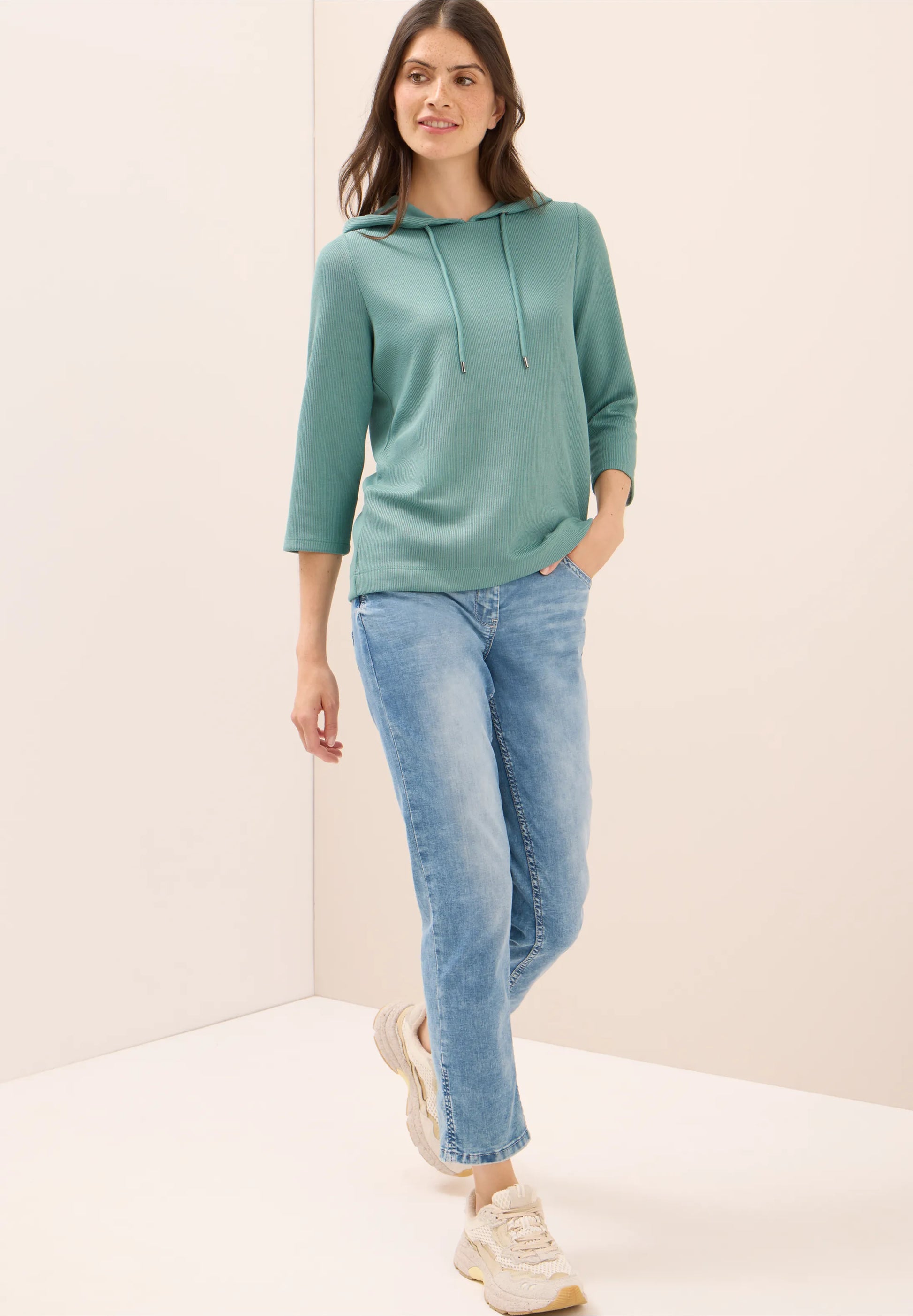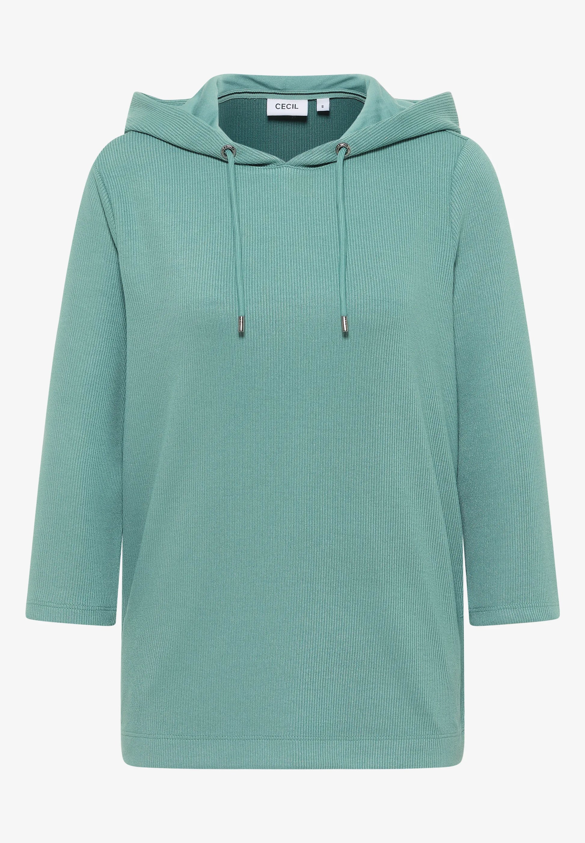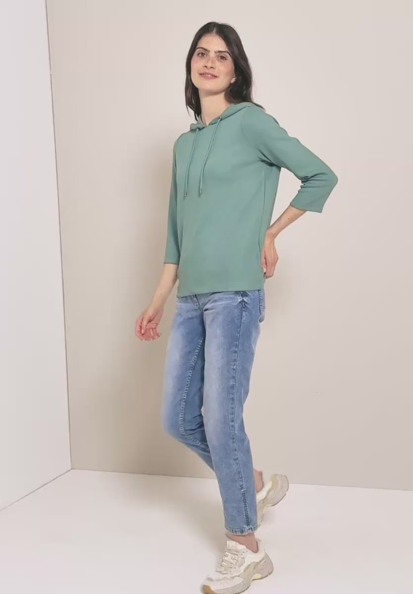 A casual hoodie top by CECIL with a modern ribbed texture and 3/4 sleeves. The soft viscose blend with stretch ensures a comfortable fit, while the drawstring hood adds a sporty twist. Perfect for laid-back everyday looks.