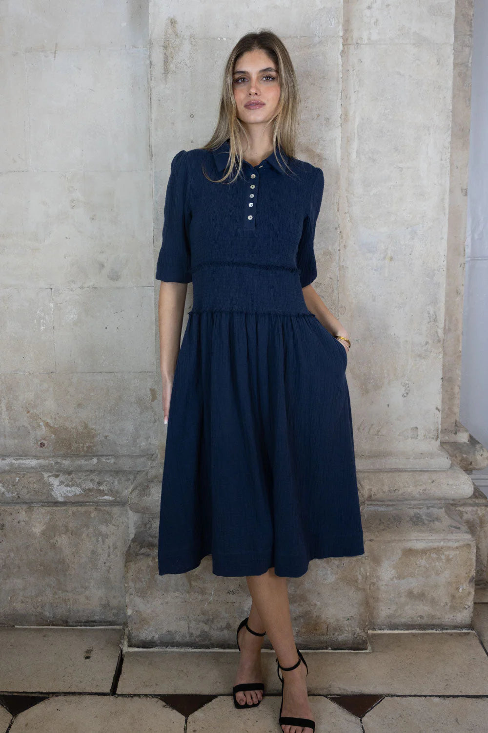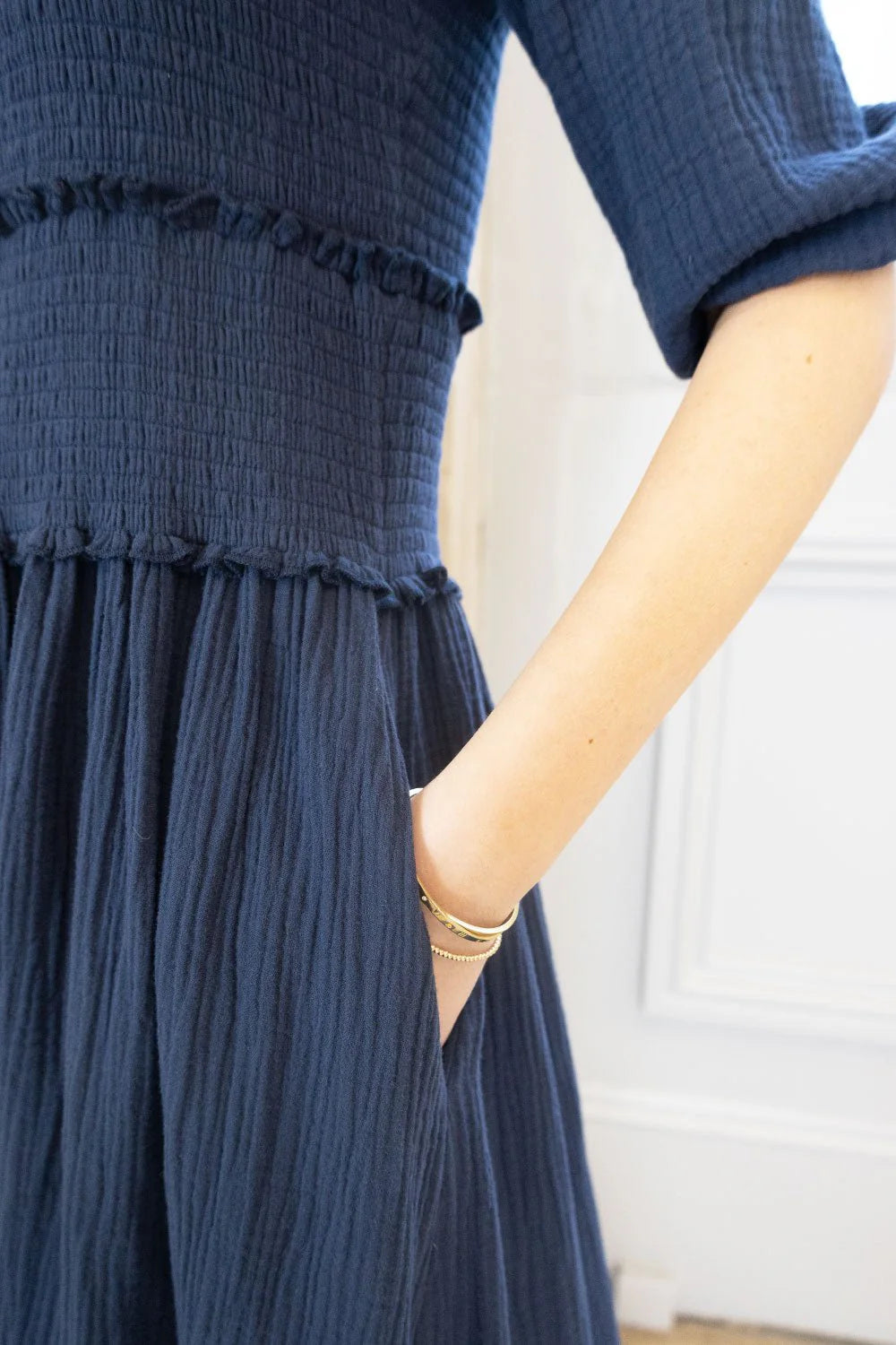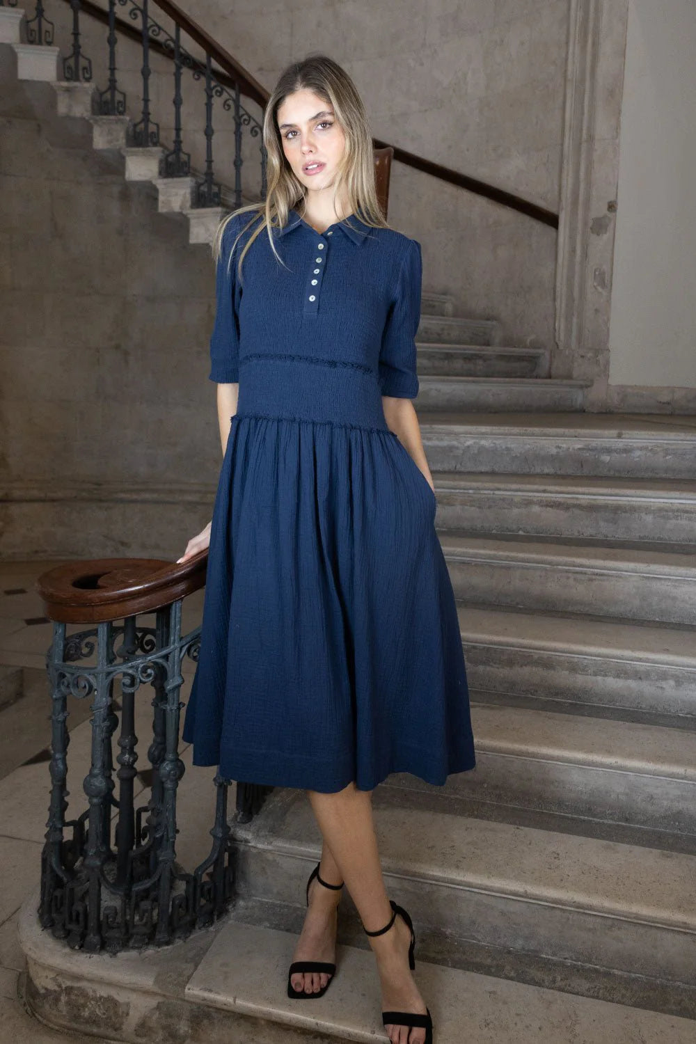 Introducing brand-new Sadie dress! Crafted from lightweight cheesecloth fabric, it's designed for minimal creasing and easy care—perfect for effortless styling. Featuring a puff sleeve, shirred bodice, buttoned placket, and handy side pockets, it’s your go-to piece for everyday wear.