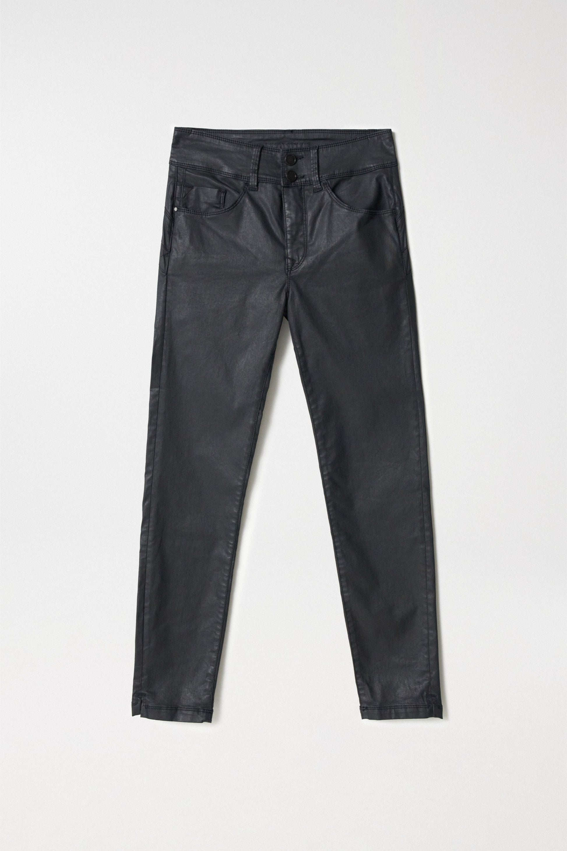 Black trousers with cotton coating. Secret Push In fit. Capri leg. Medium Rise with two smoky black buttons. Hem with small cut at the side. Zip. Belt loops.