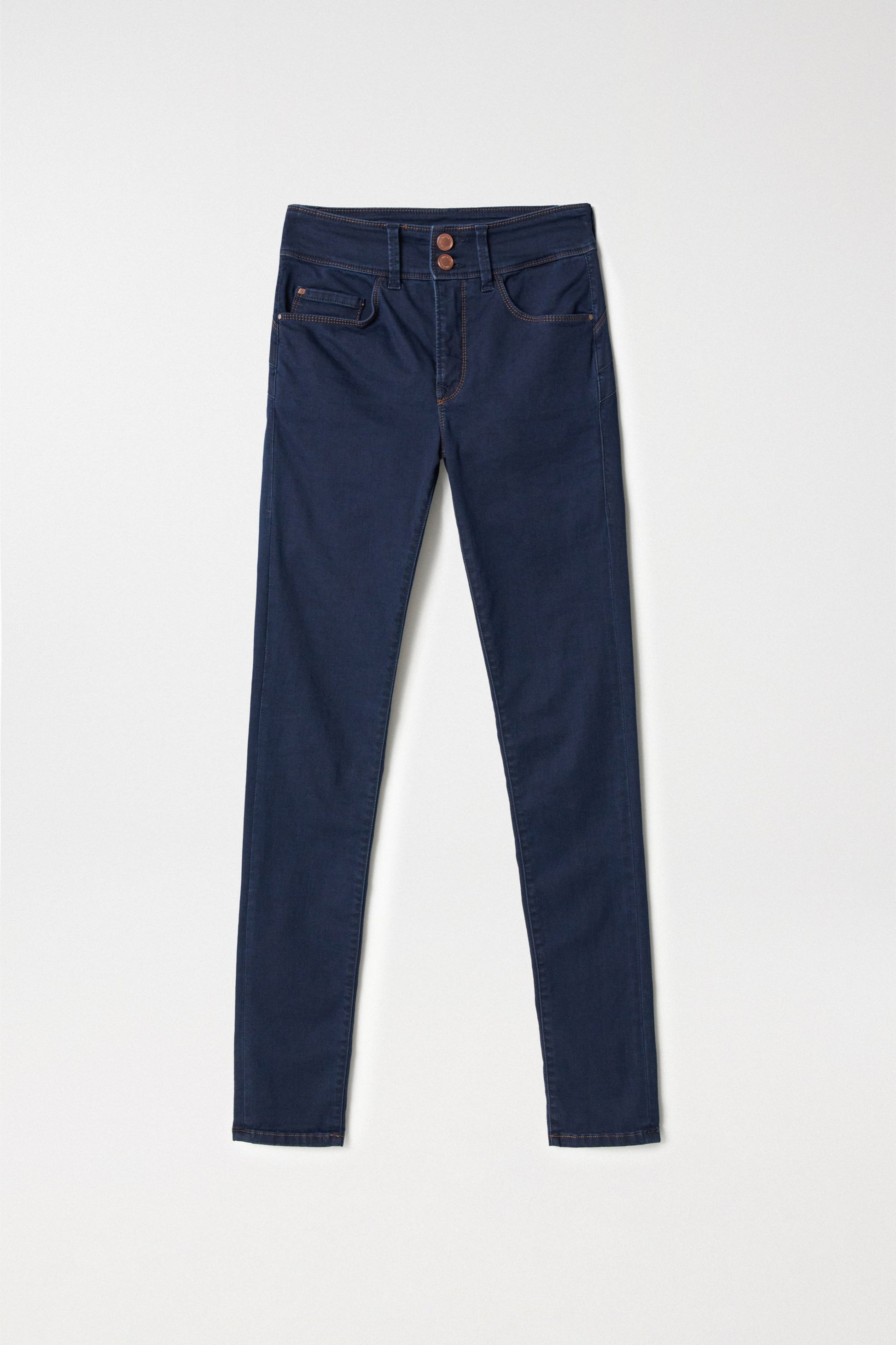 Secret Push In soft touch jeans. Skinny leg. Medium Rise. Zip fly with two bronze buttons. Belt loops. Five pockets. Dark wash.