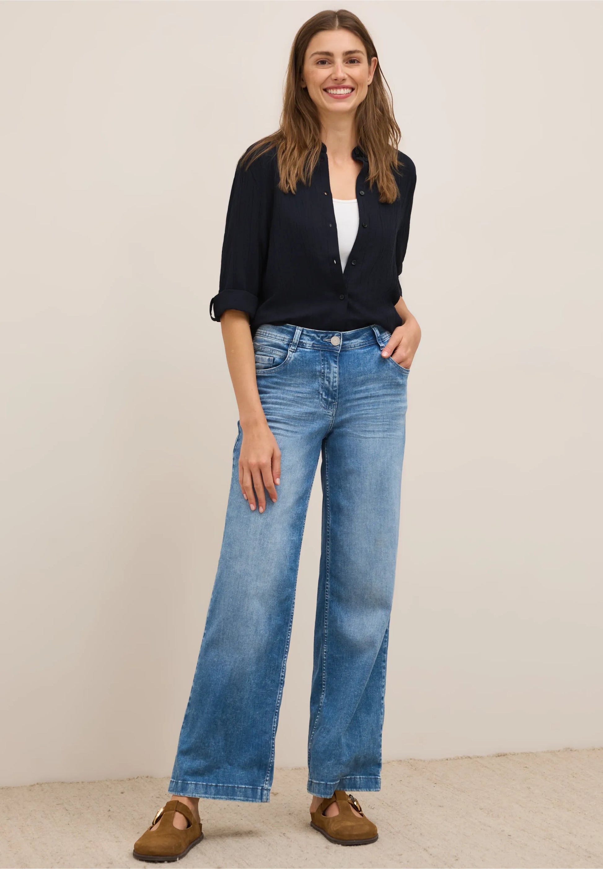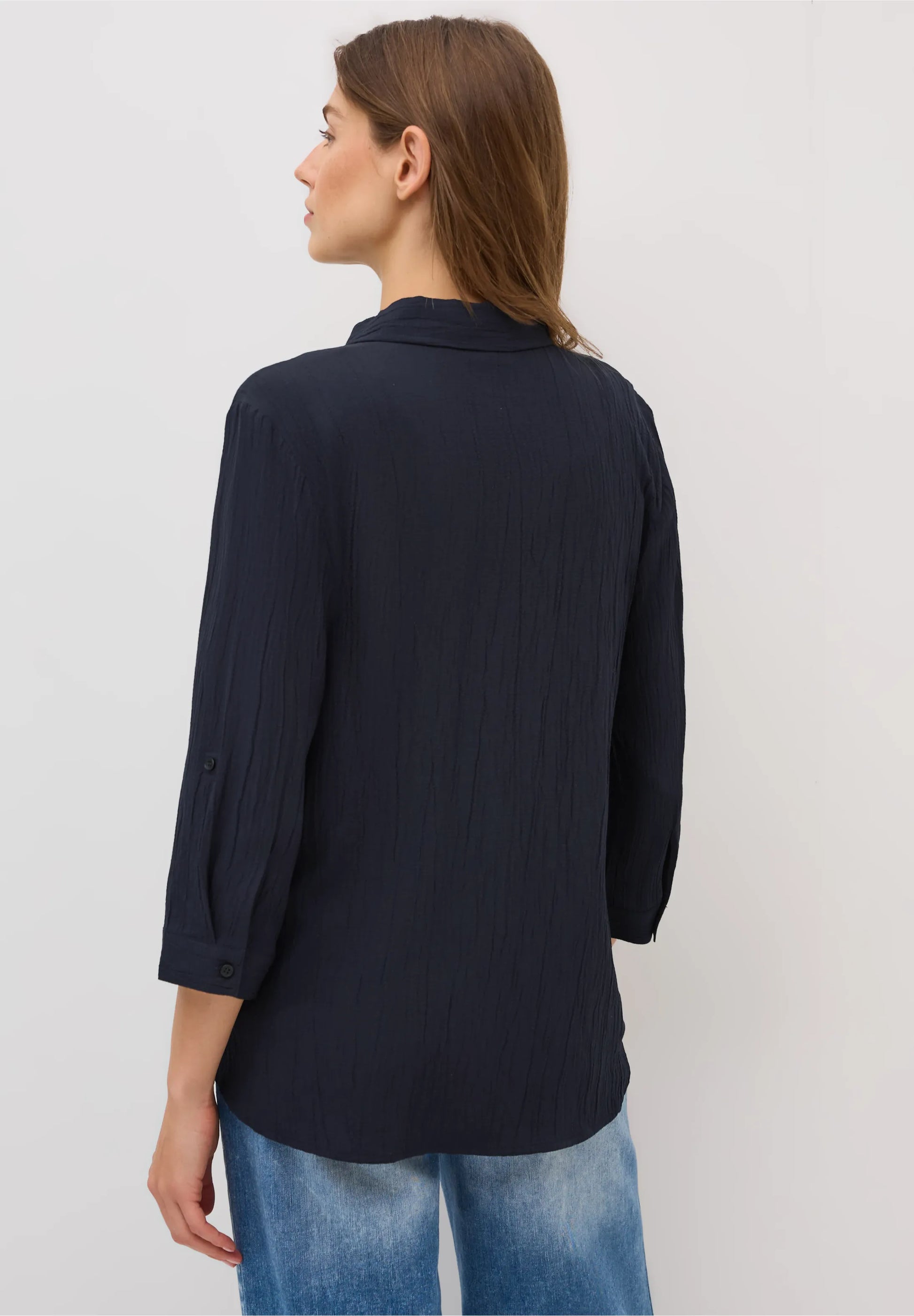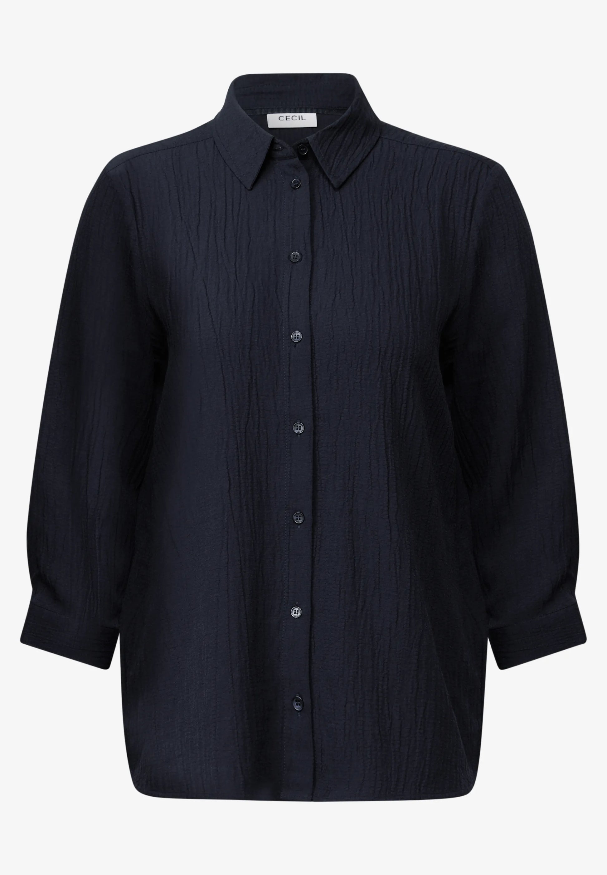 This structured shirt blouse by Cecil features a classic shirt collar, full button placket and 3/4 sleeves with a practical turn up – offering a smart yet relaxed look. Made from light seersucker fabric, it feels pleasantly airy on the skin. The rounded hem adds to the casual, easy going fit, making it perfect for warm days.