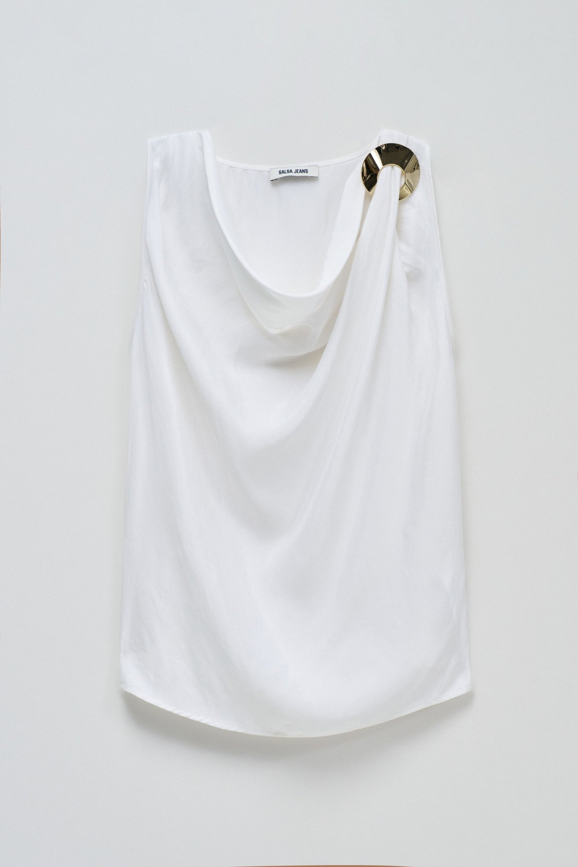 Elegant and sophisticated, this sleeveless top features a soft draped neckline and a statement gold-tone ring detail on the shoulder. Crafted from a lightweight fabric with a smooth finish, it's perfect for both smart and casual looks. Style it with tailored trousers or a skirt for a polished ensemble.