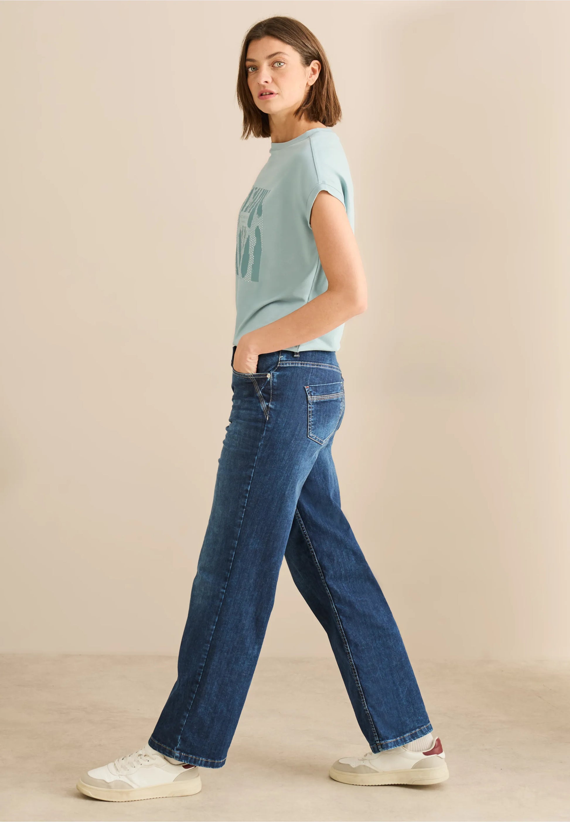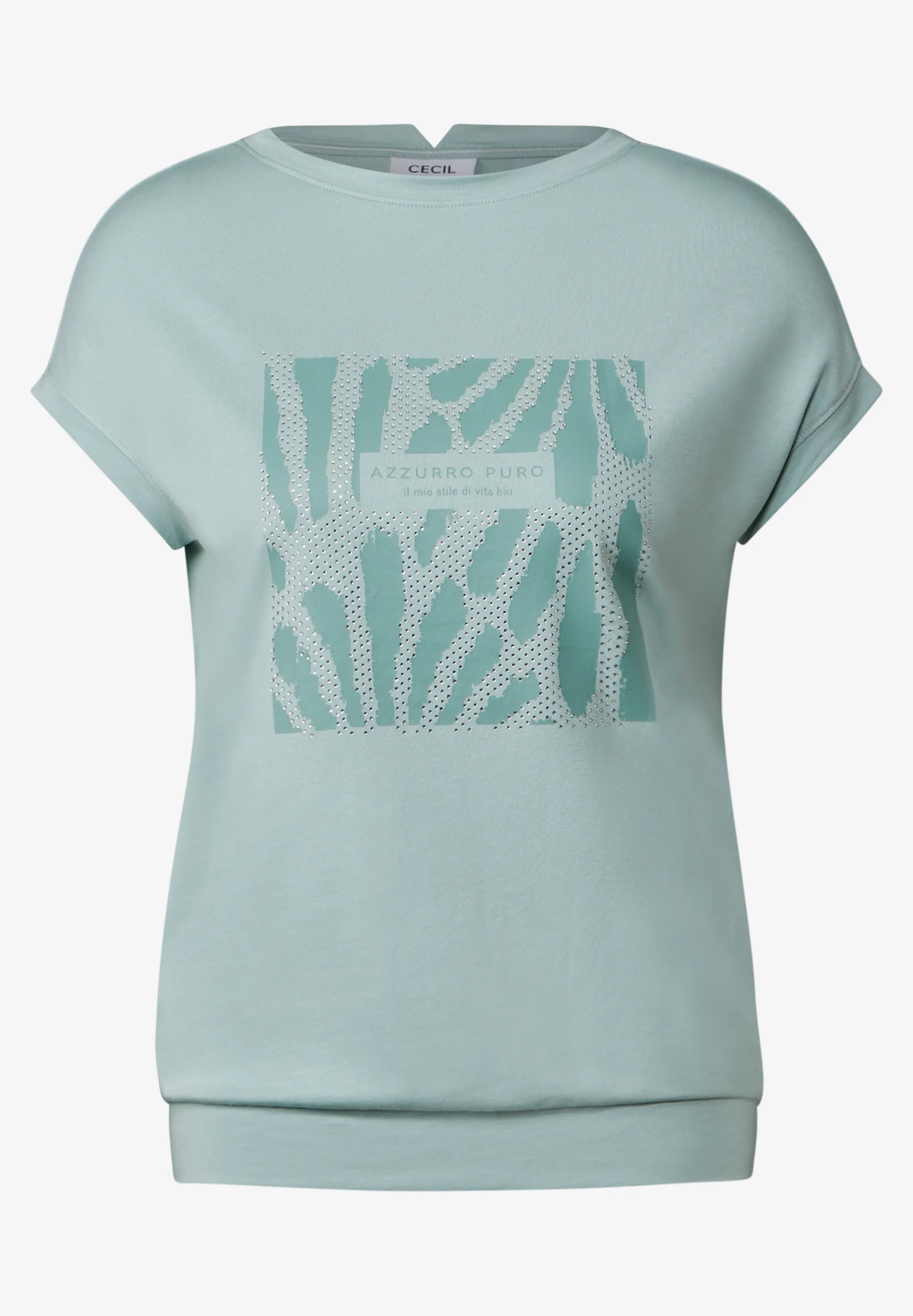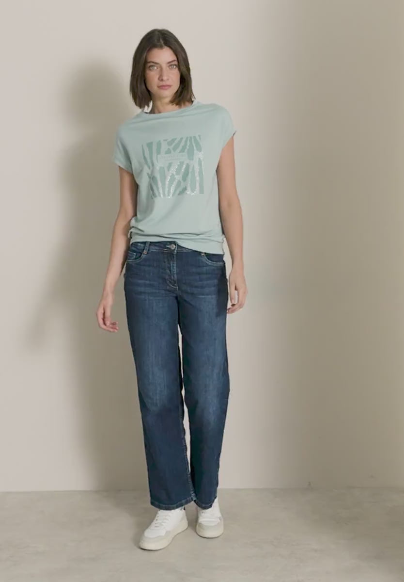 This T-shirt by CECIL for women inspires with a fashionable artwork print with gemstones. The shirt has a boat neckline and short sleeves. The material mix with stretch content makes the T-shirt a comfortable and stylish must-have for every day.