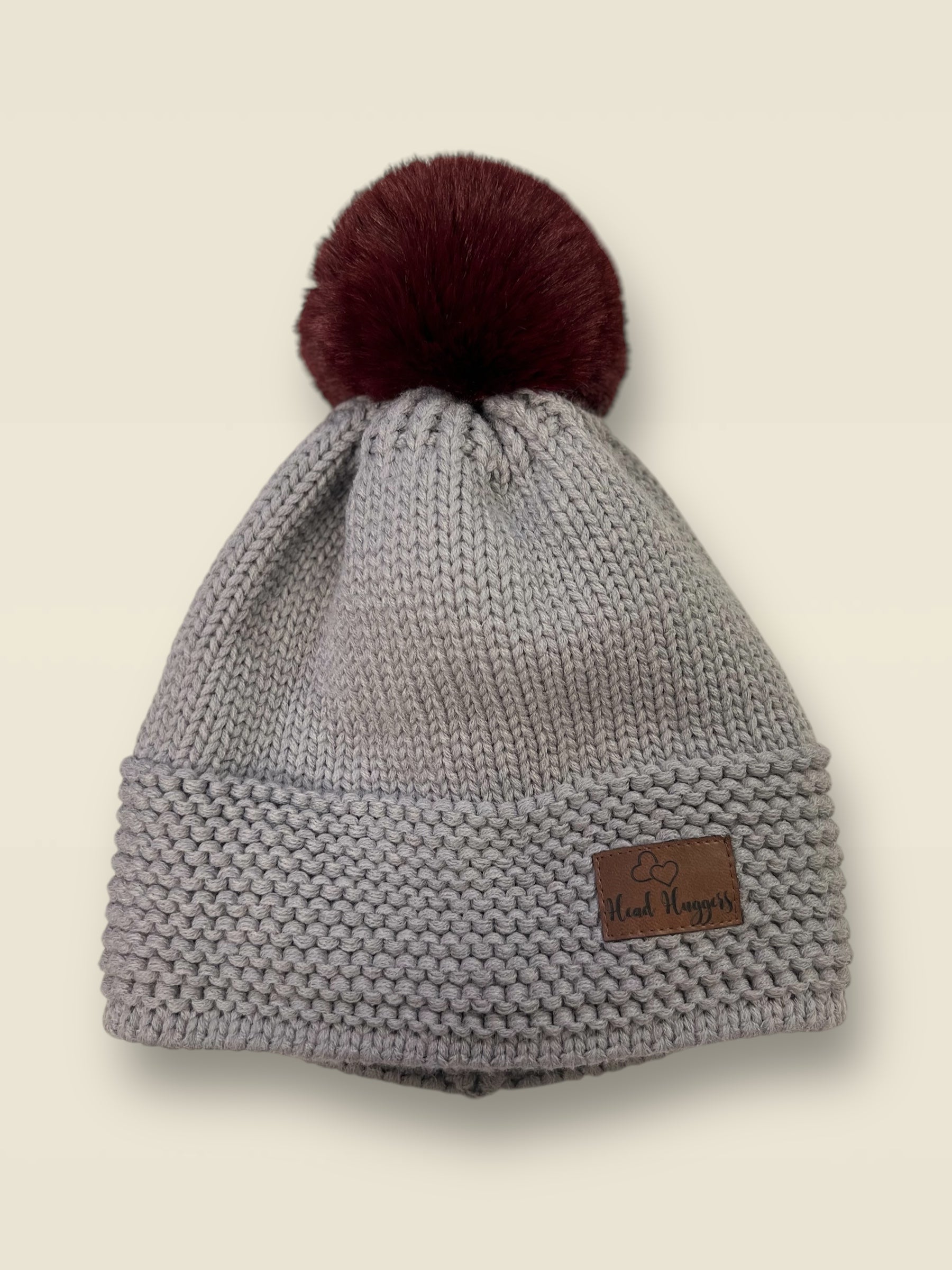 The Head Huggers Hat with Brown Pom-Pom, Light Grey