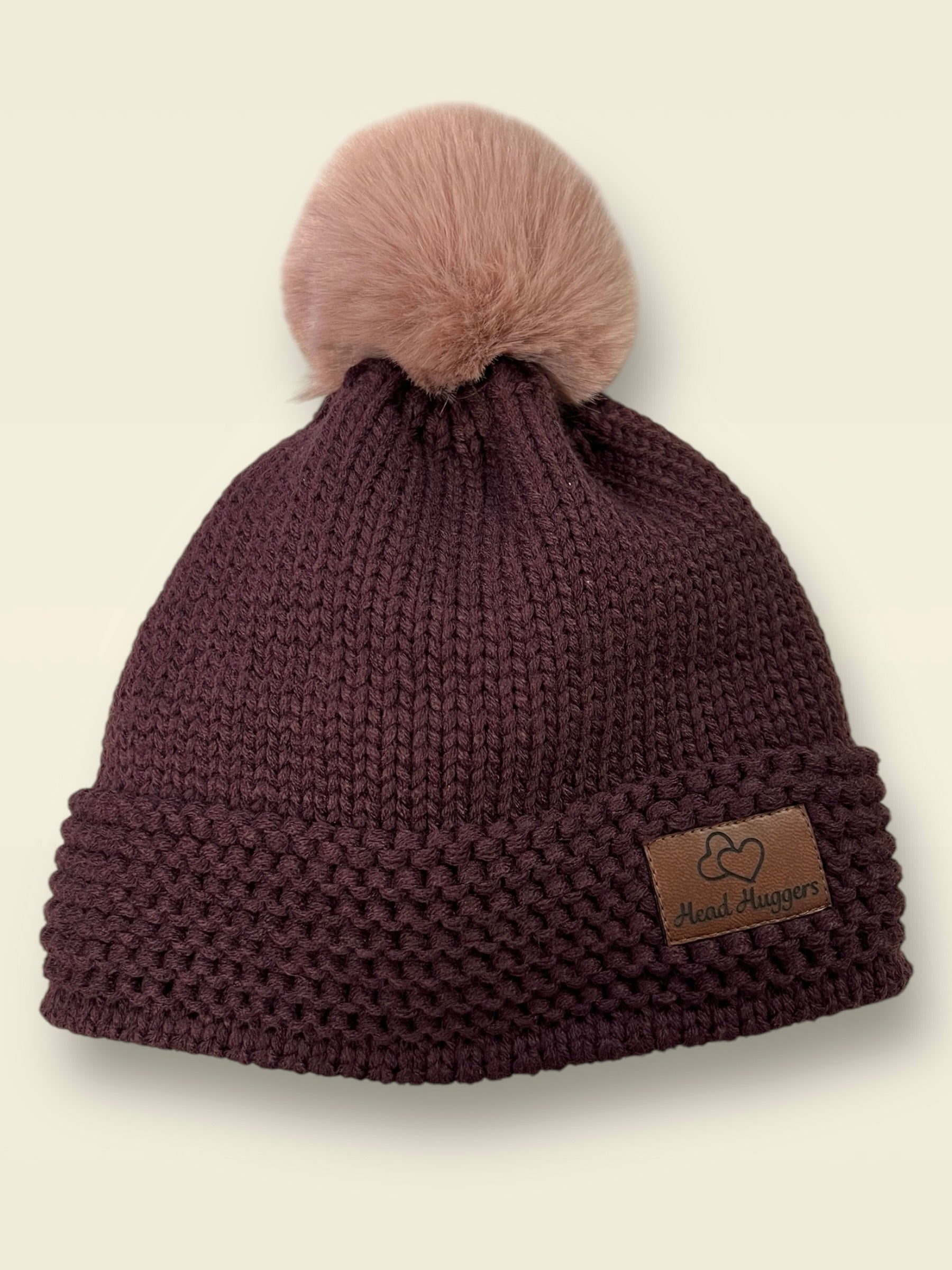 The Head Huggers Hat with Dusty Rose Pom-Pom, Chocolate Brown