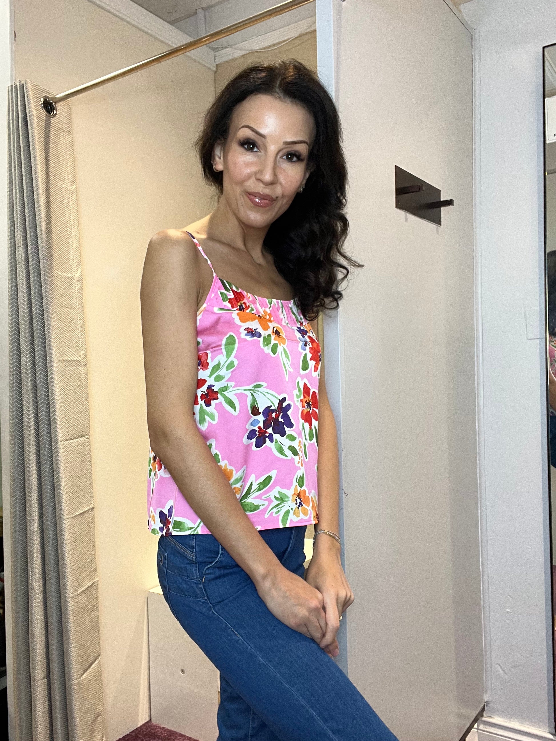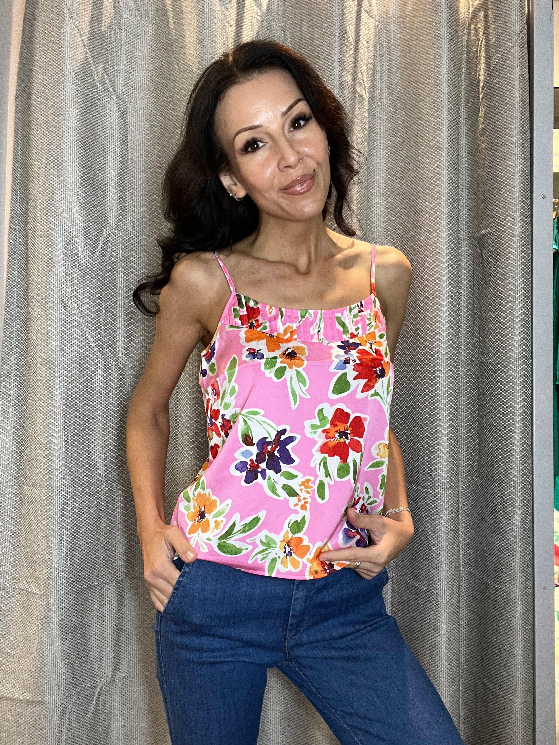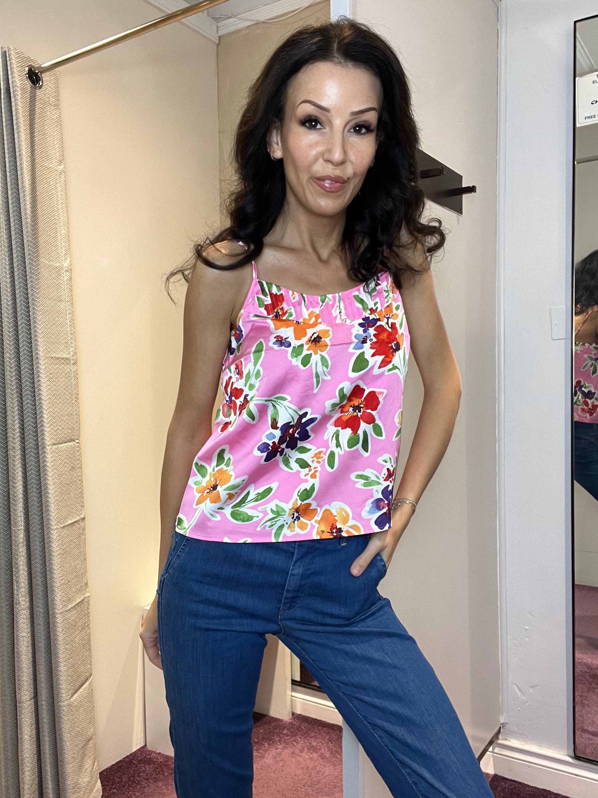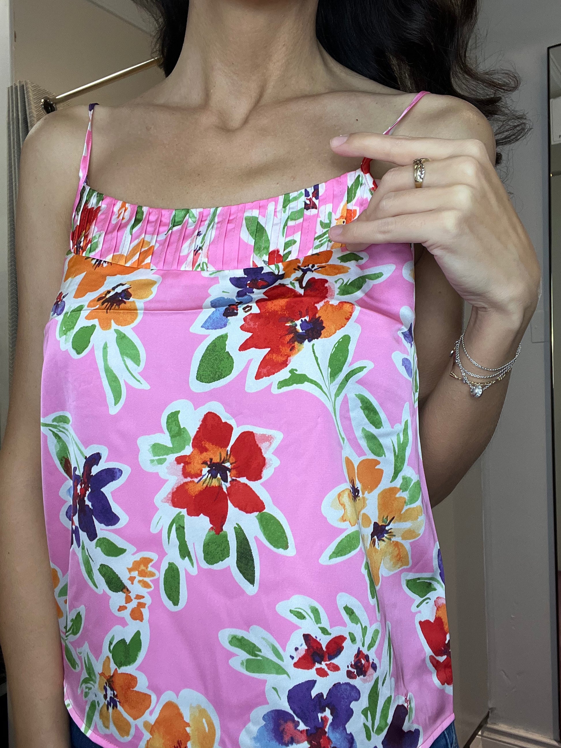 This top combines delicacy and modernity, ideal for light and sophisticated looks. The floral pattern in shades of pink brings freshness and a romantic touch. With a slim fit, it elegantly adjusts to the body, enhancing the silhouette. The round neckline with pleats adds detail and movement, while the thin straps ensure a feminine and airy touch, perfect for warmer days.