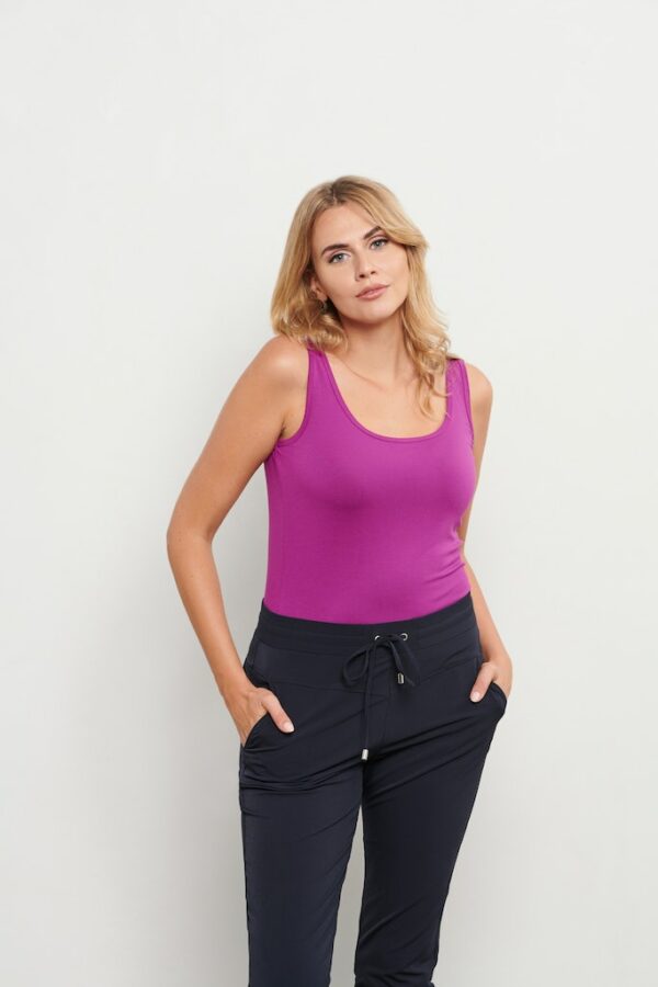 The Vesper singlet features a flattering slim fit with a deep round neckline and wide shoulder straps. Crafted from a comfortable stretch fabric, it's perfect for layering or wearing on its own. A versatile wardrobe essential for everyday wear.