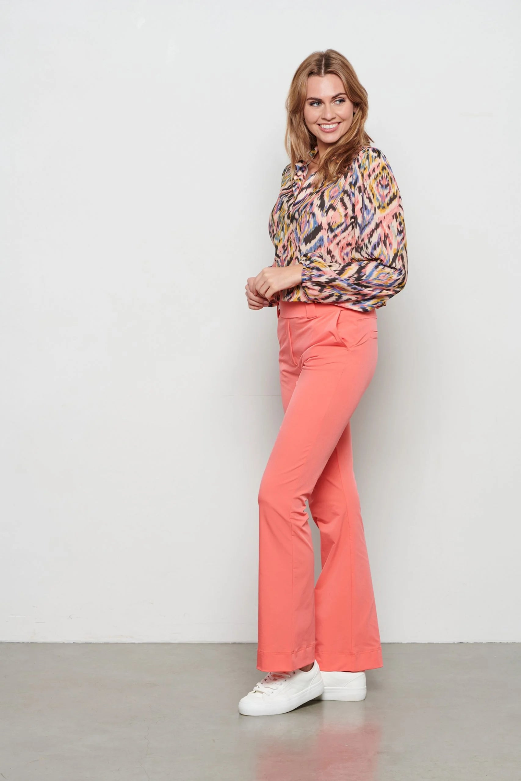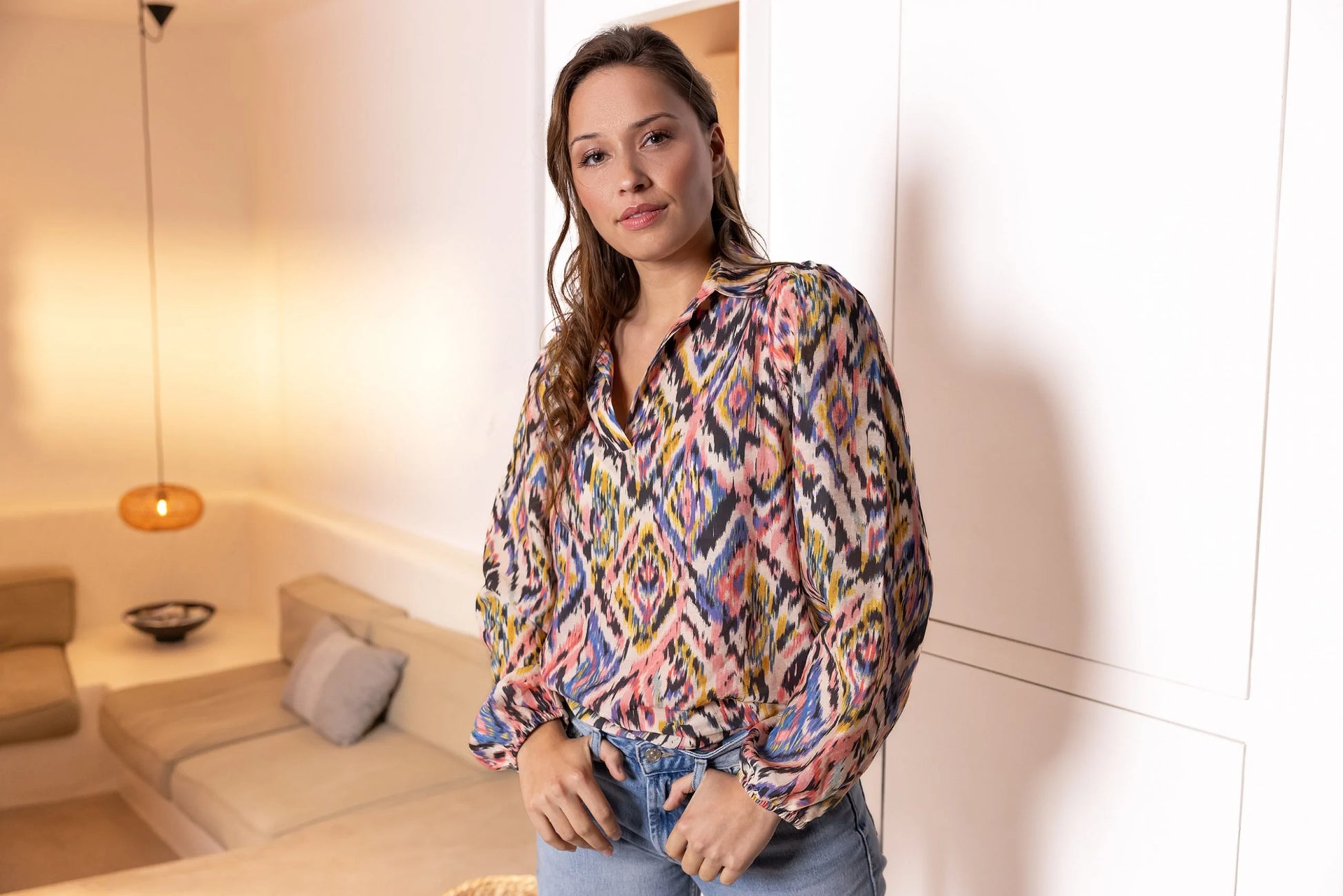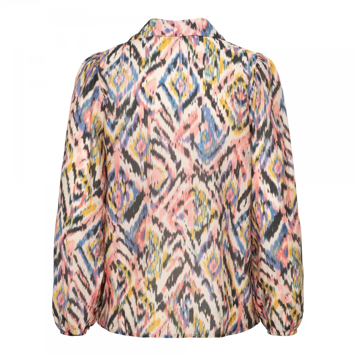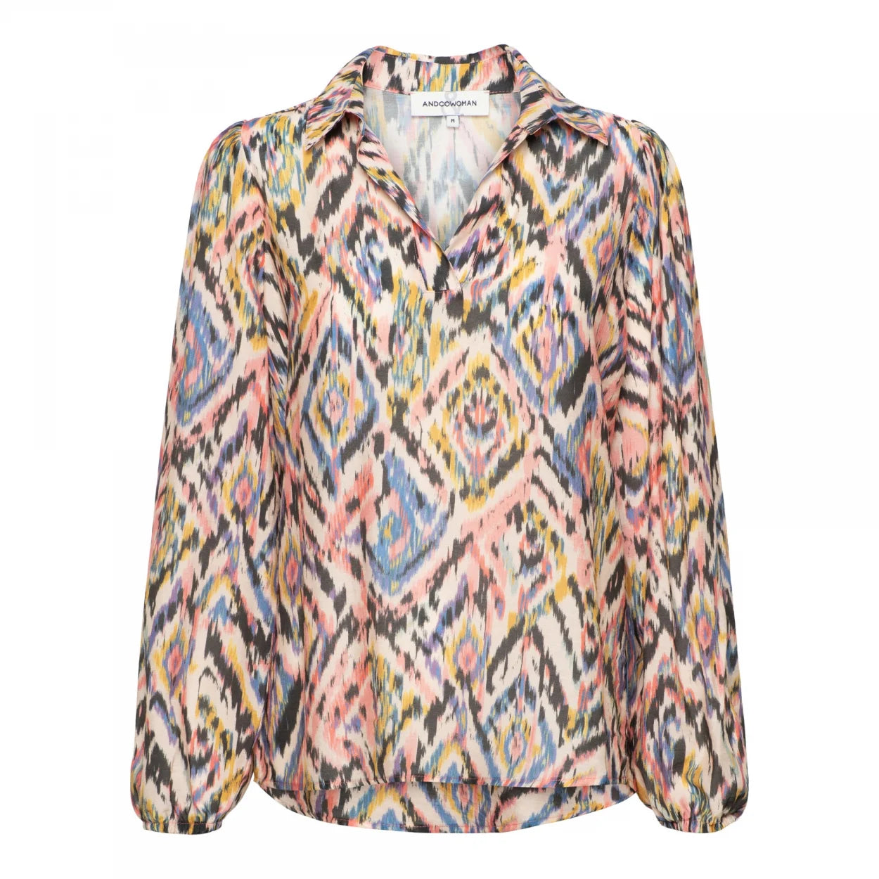 The Wendy shirt by &Co Woman features a soft viscose fabric and a vibrant ikat print. Designed with a flattering V-neckline and subtle collar stand, it’s finished with puffed sleeves and elasticated cuffs for a feminine touch.