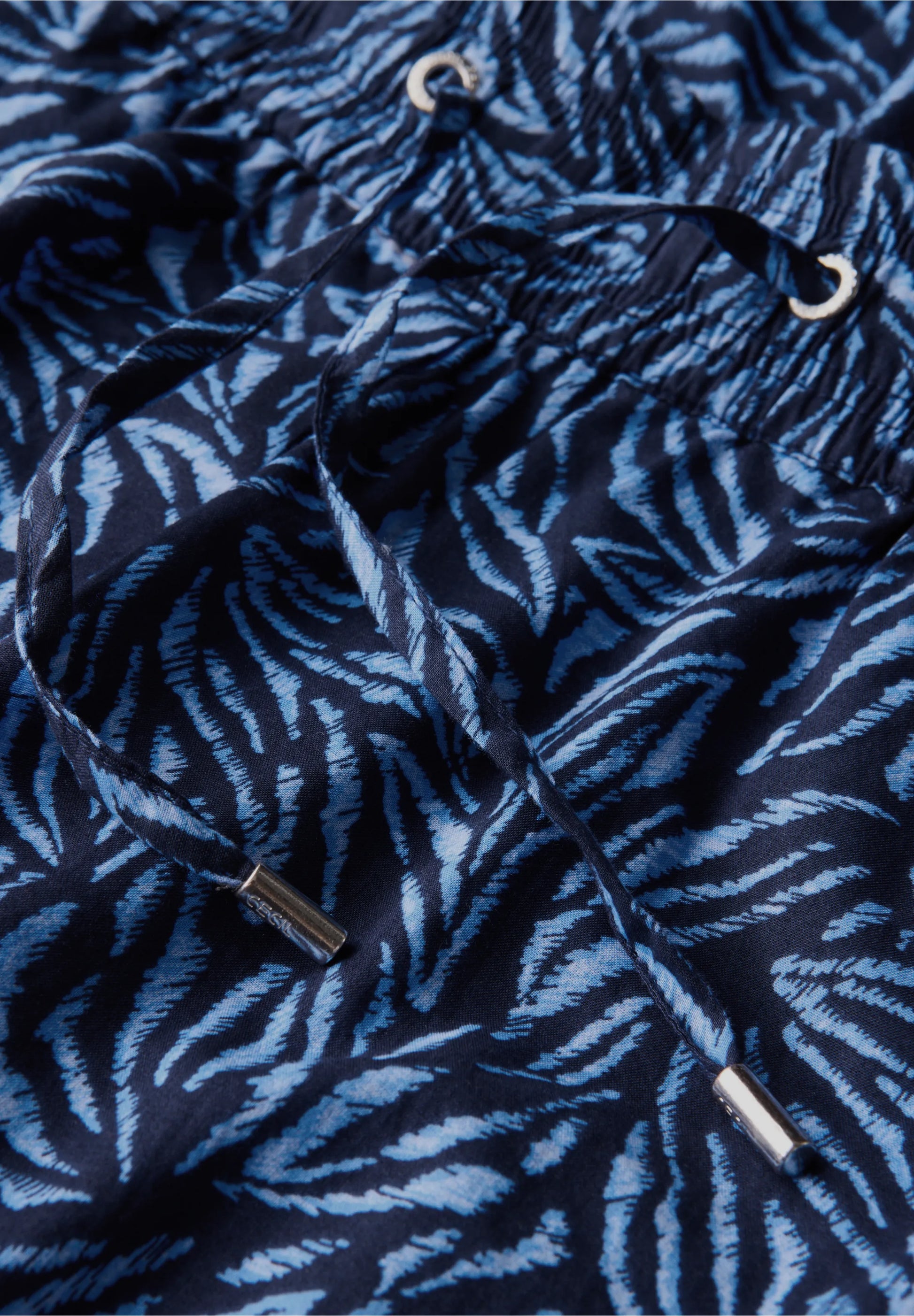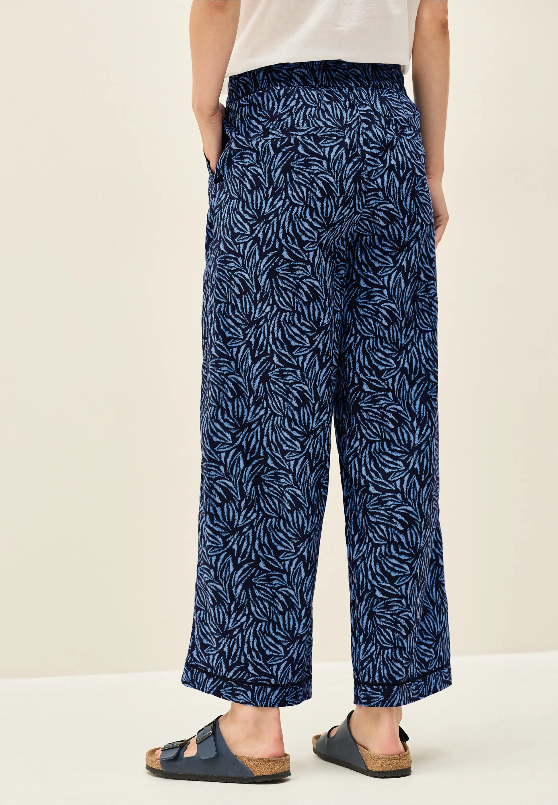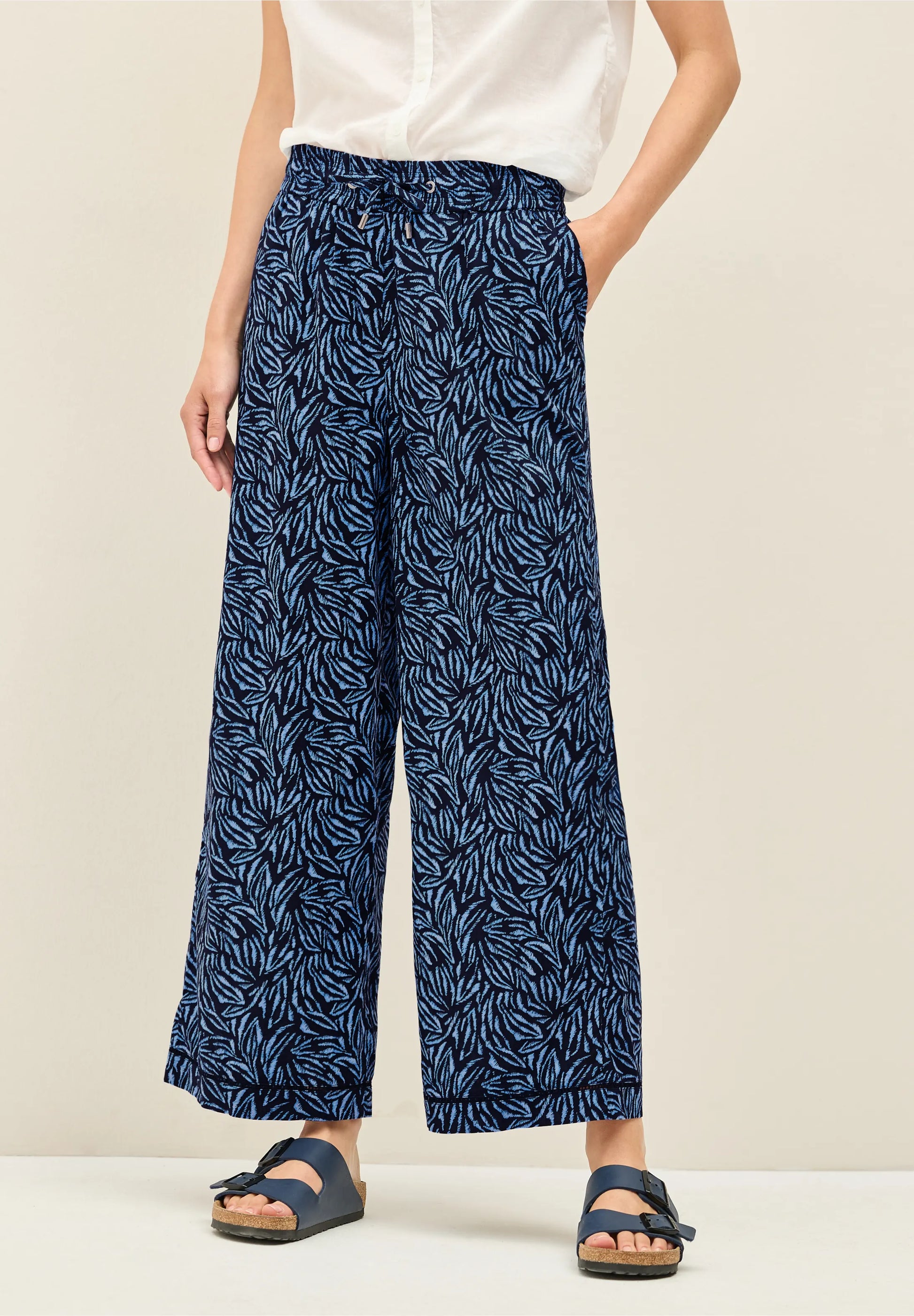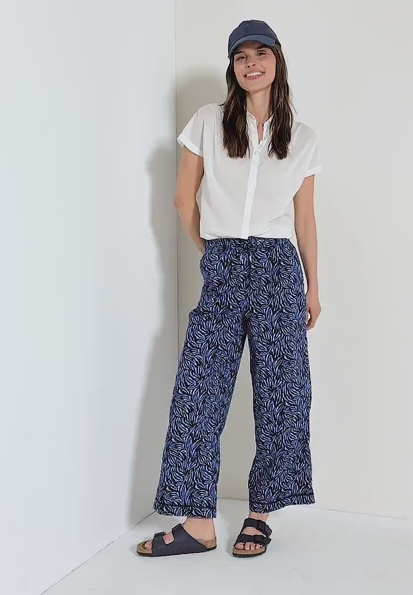 These wide leg trousers by CECIL combine a striking graphic pattern with sporty tape detailing for a modern twist. The elasticated drawstring waistband ensures a relaxed and comfortable fit, while the pure cotton fabric feels light and breathable, perfect for easygoing summer outfits with a touch of style.